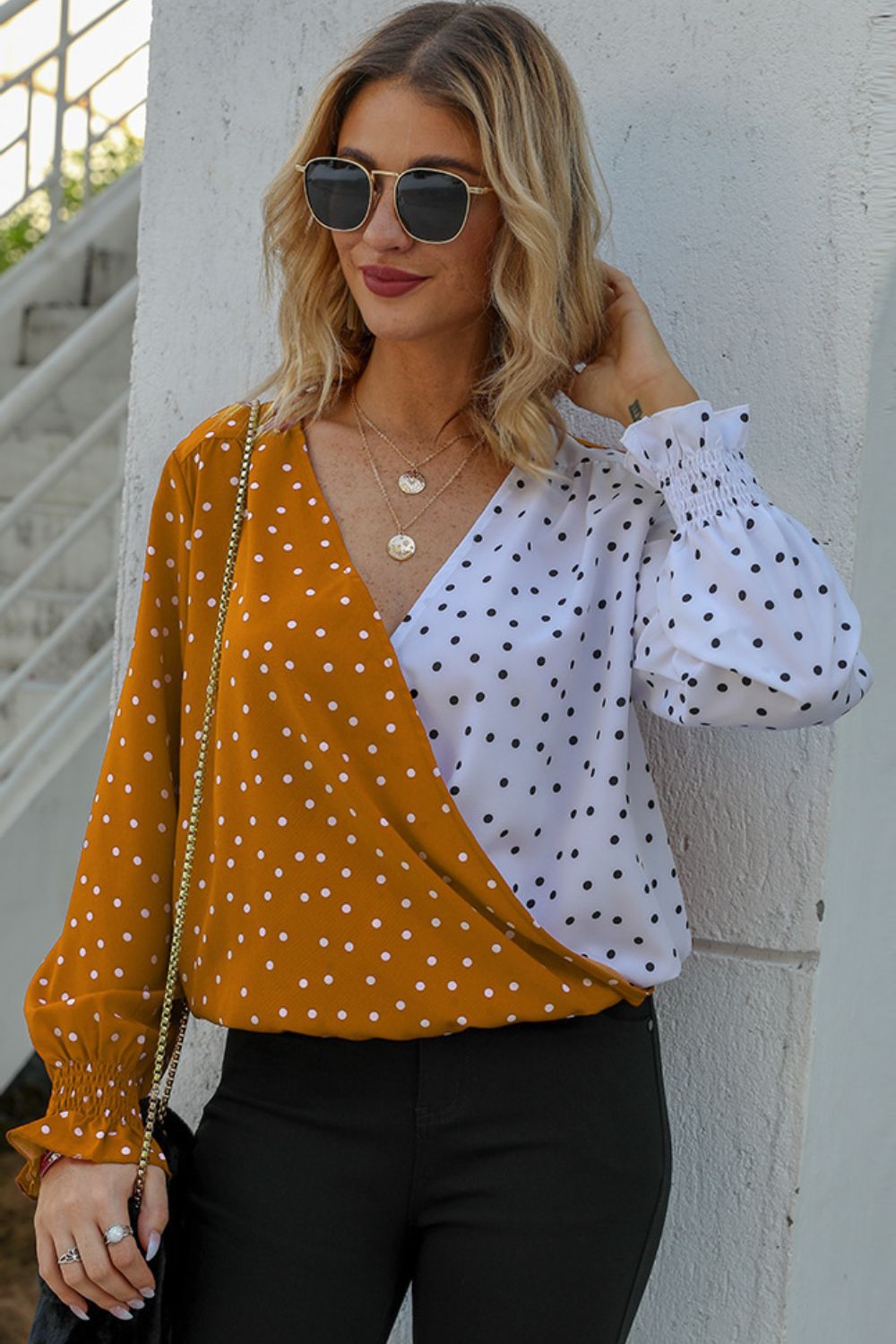 Polka Dot Surplice Neck Lantern Sleeve Blouse