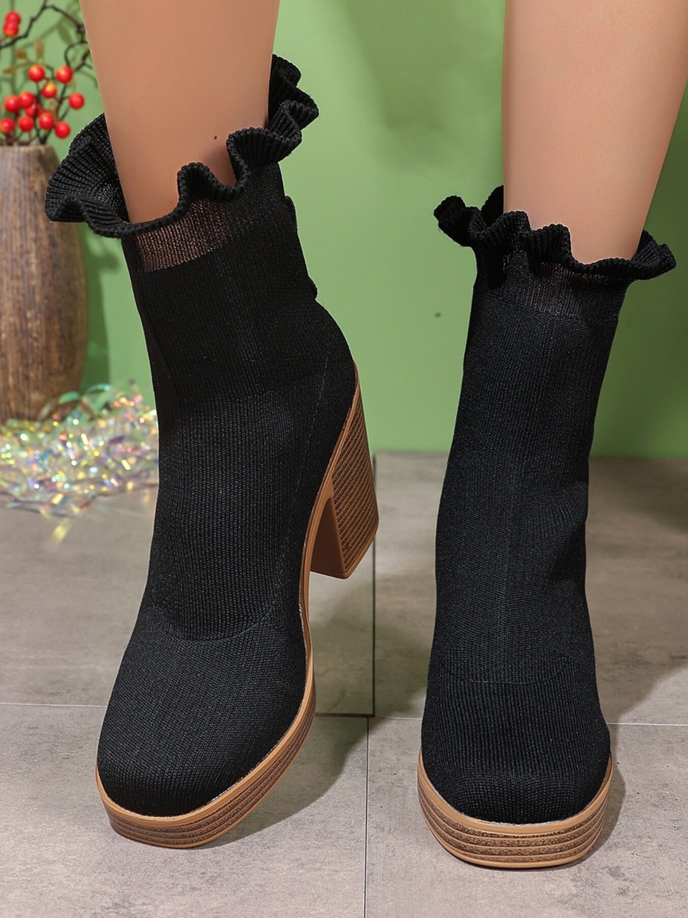 Ruffled Trim Chunky Heel Boots