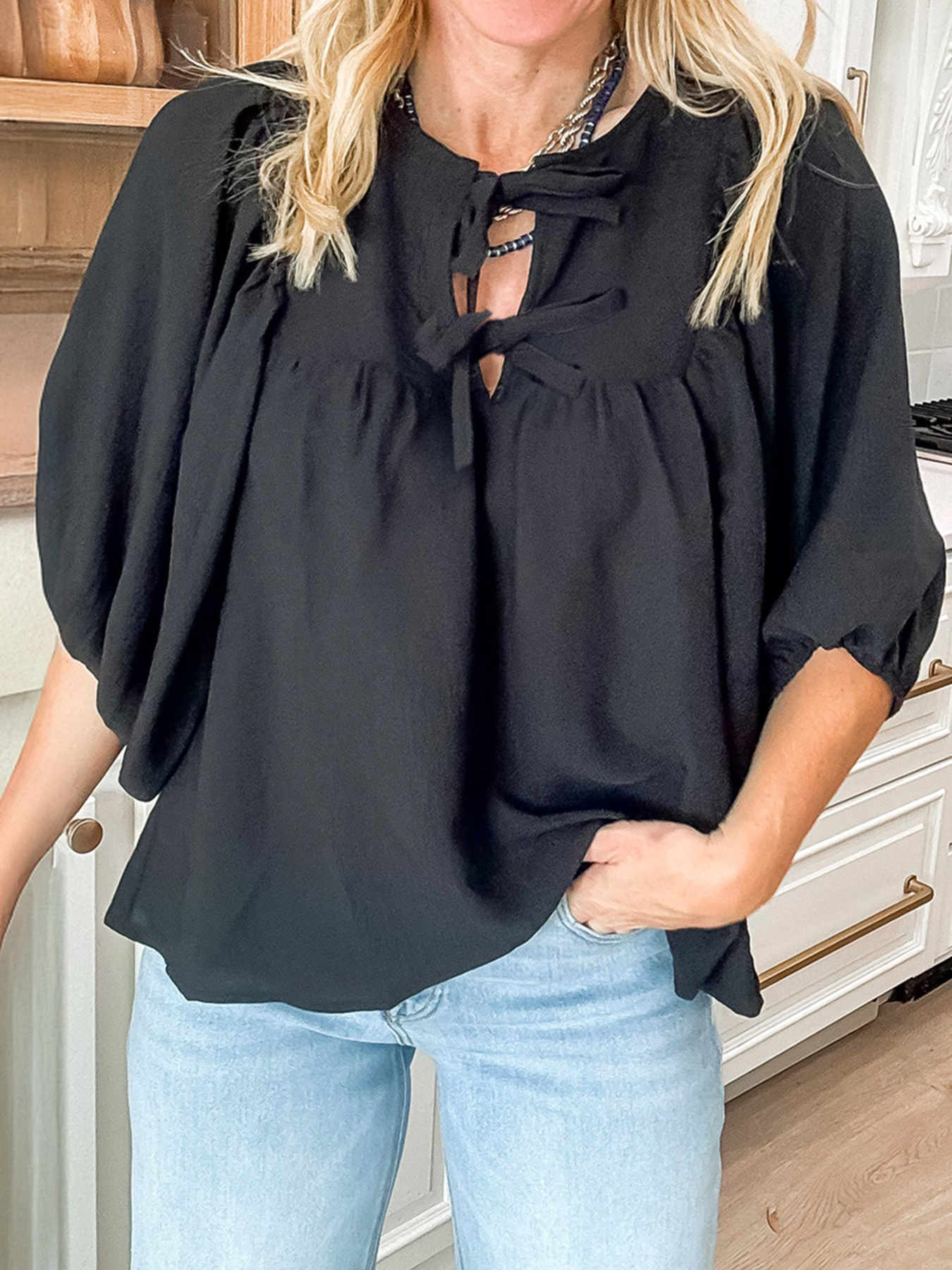 Bow Tie Neck 3/4 Sleeve Casual Blouse