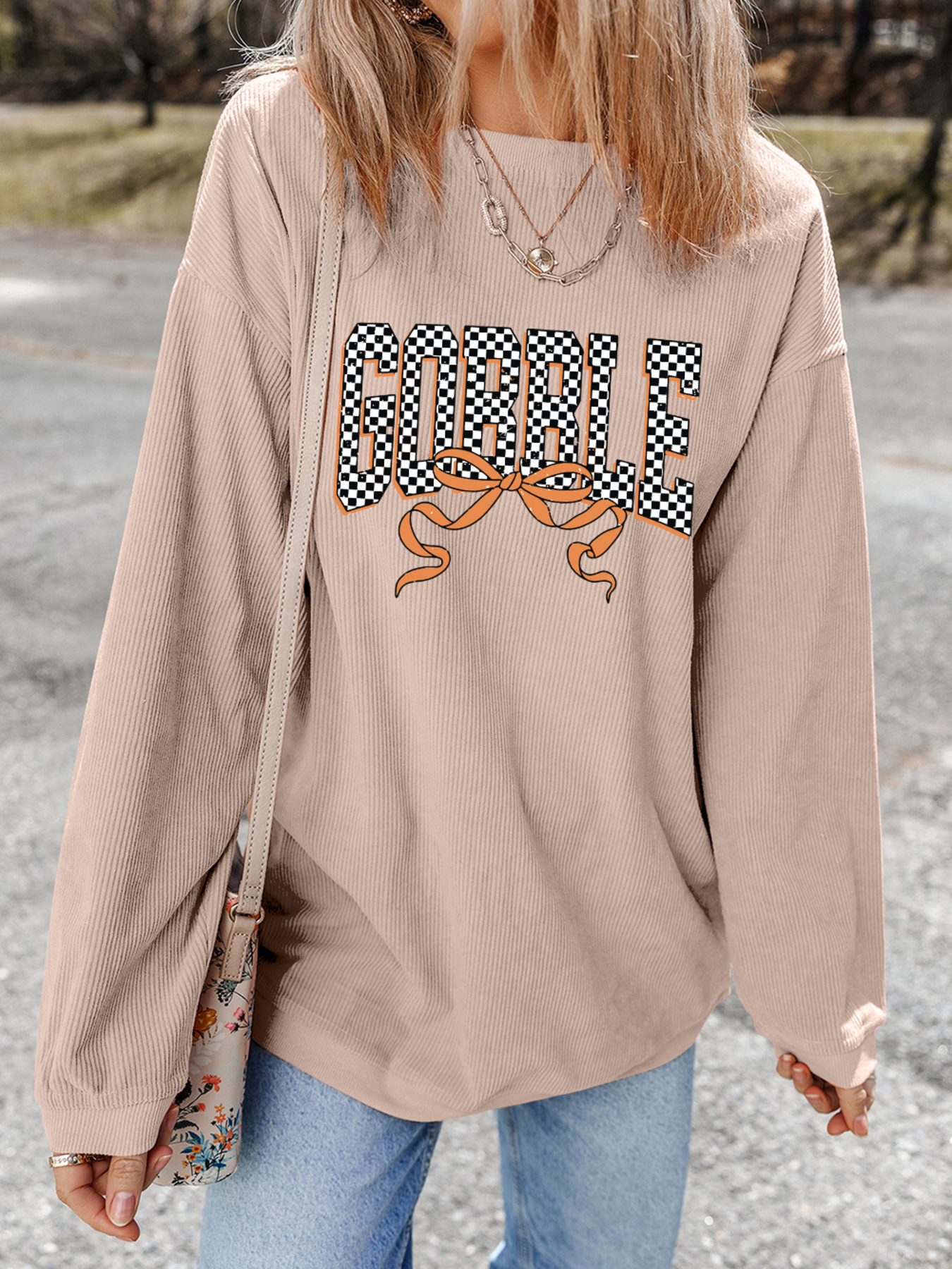 Twisted Ribbed Texture Checkered GOBBLE Bow Baggy Sweatshirt