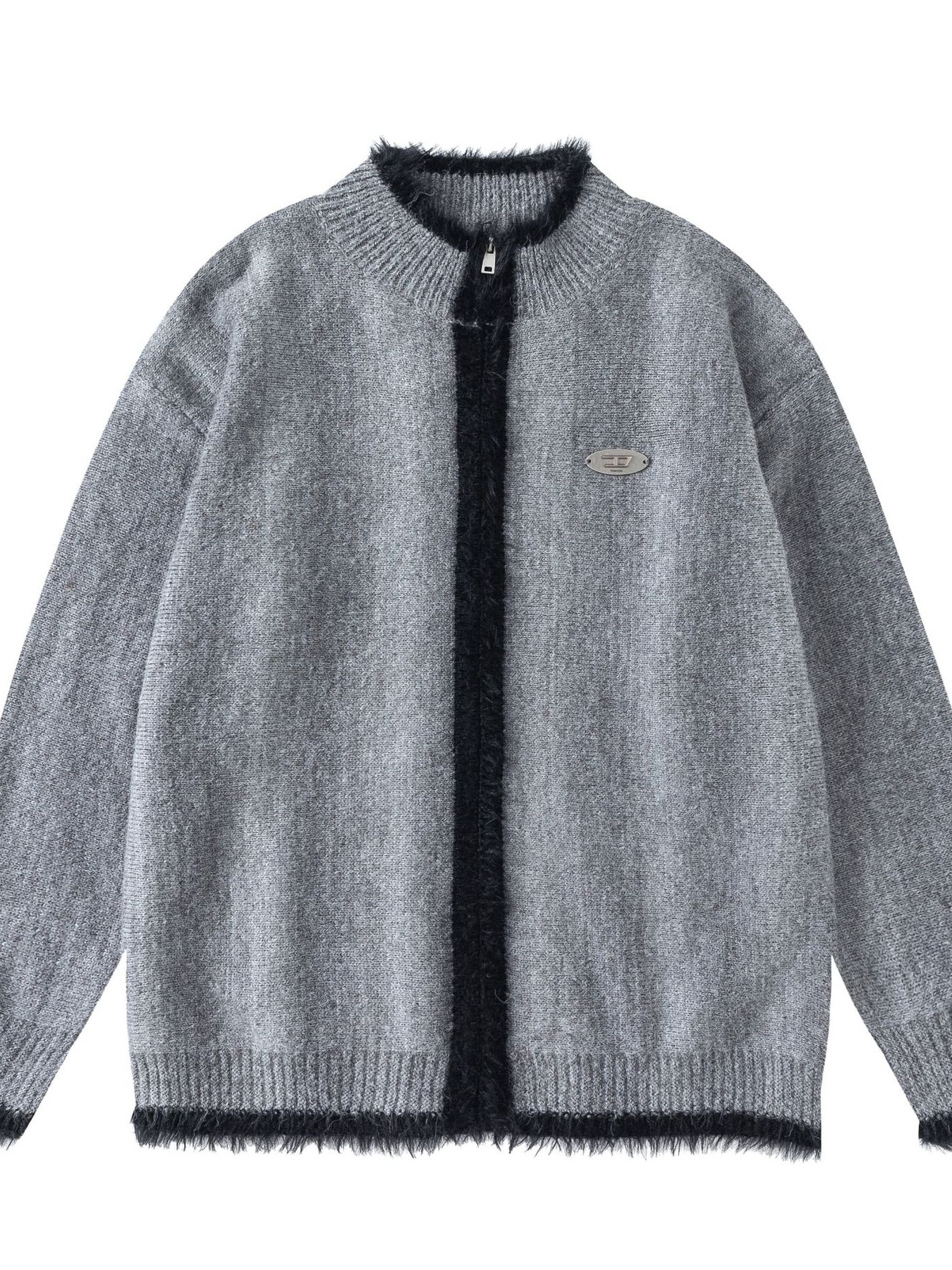 Men's Distressed Hem Ribbed Knit Zip-Up Cardigan