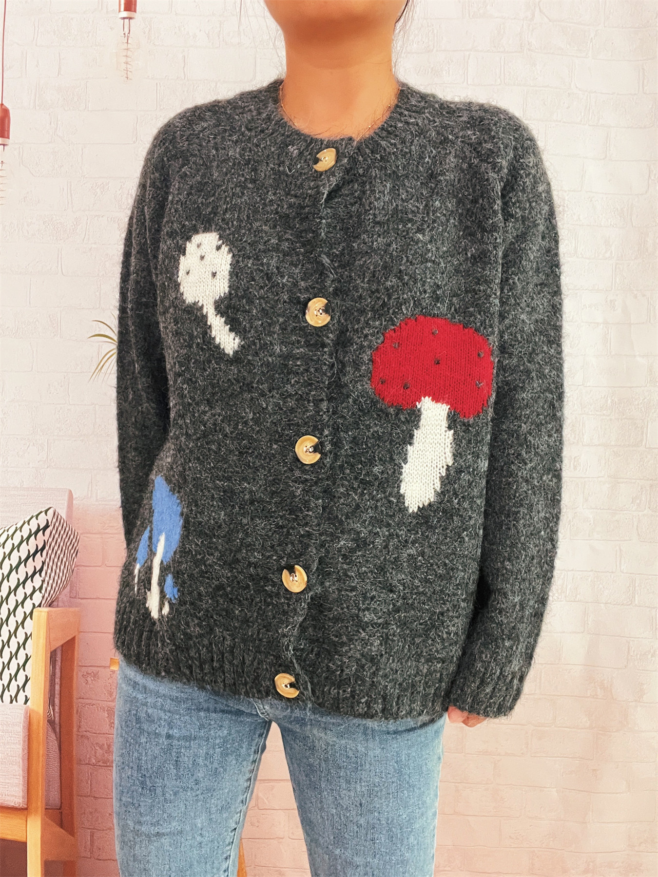 Mushroom Pattern Button-Up Cozy Knit Cardigan