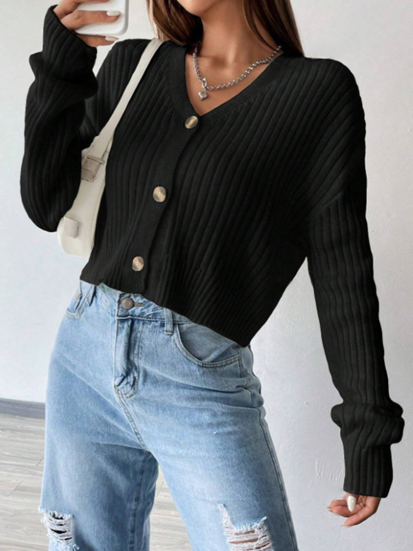 Solid Color Knit Button Drop Shoulder Sweater Cardigan