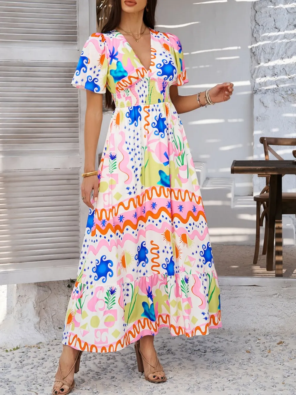 Smocked Printed V-Neck Short Sleeve Maxi Dress