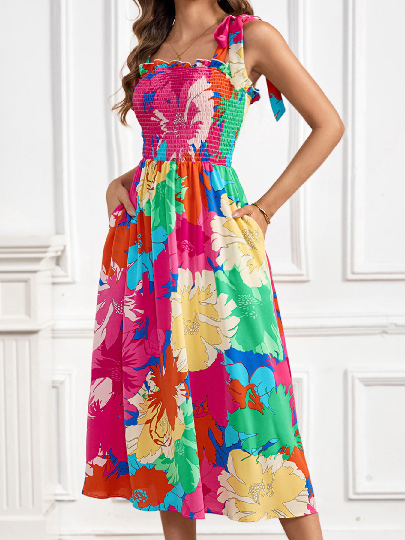 Smocked Printed Tie Shoulder Midi Dress