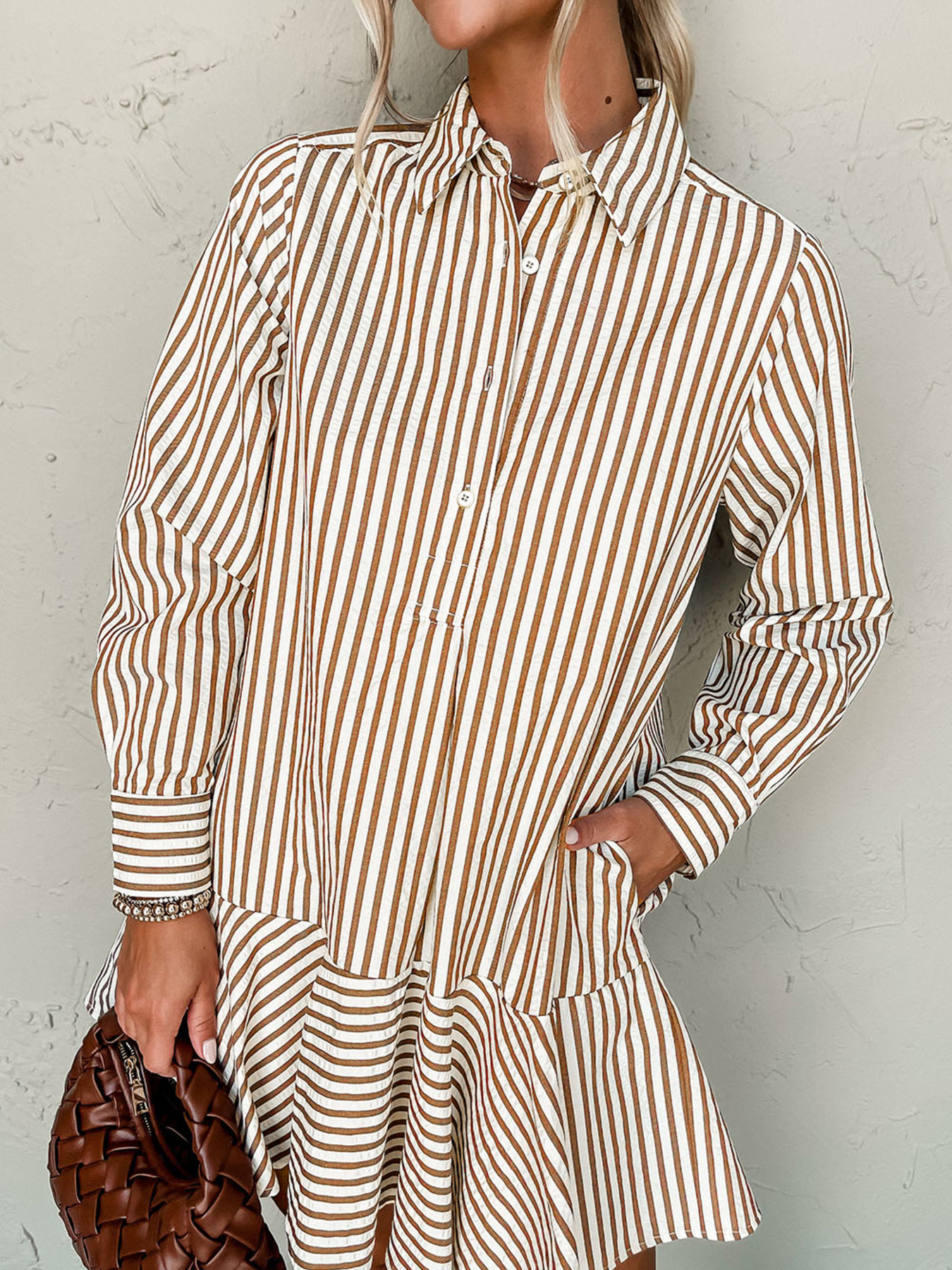 Stripe Ruffled Hem Collared Long Sleeve Shirt Mini Dress