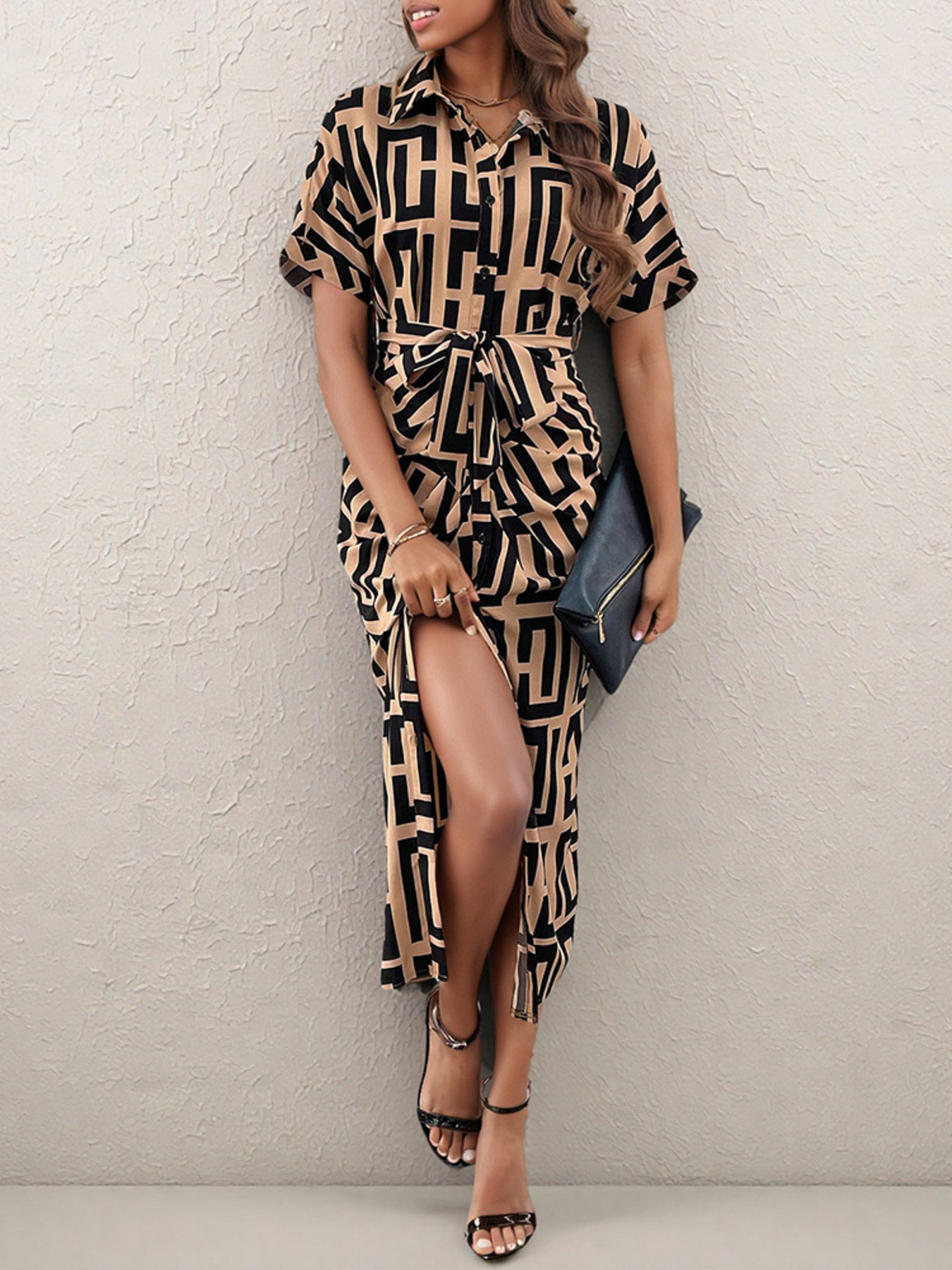 Geometric Print Belted Midi Dress