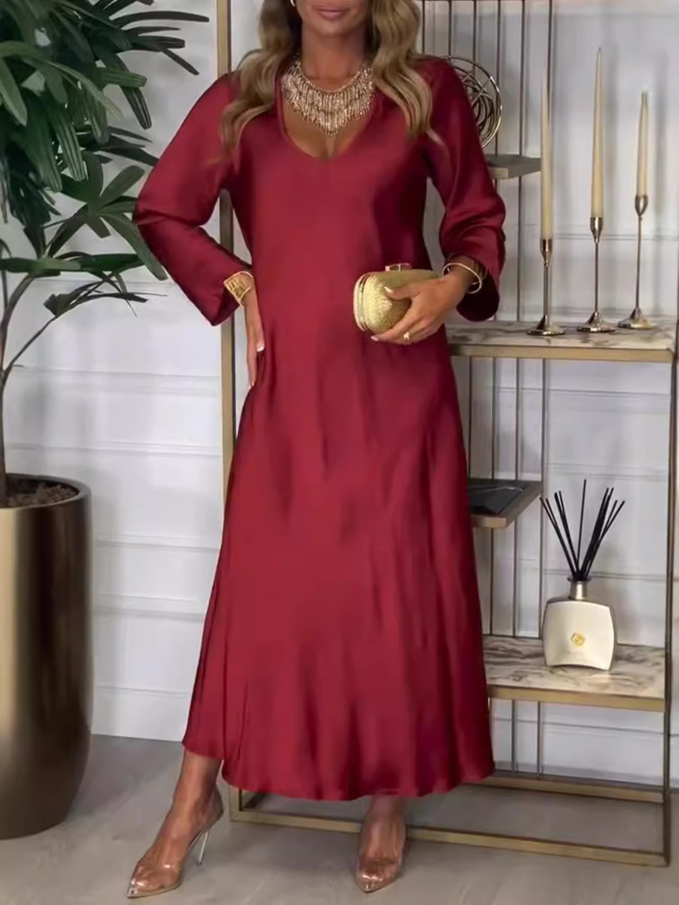 Full Size V-Neck Long Sleeve Midi Dress Plus Size