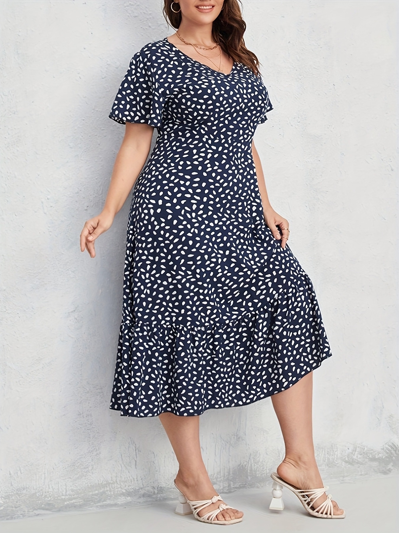 Plus Size Printed V-Neck Short Sleeve Midi Dress