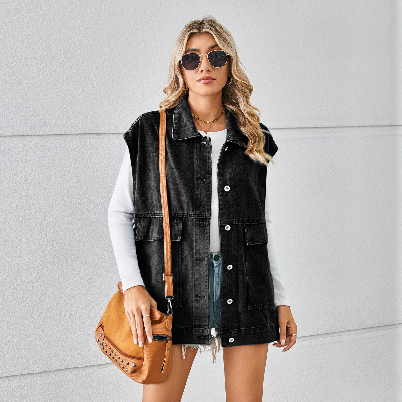 Drawstring Pocketed Button Up Sleeveless Denim Jacket