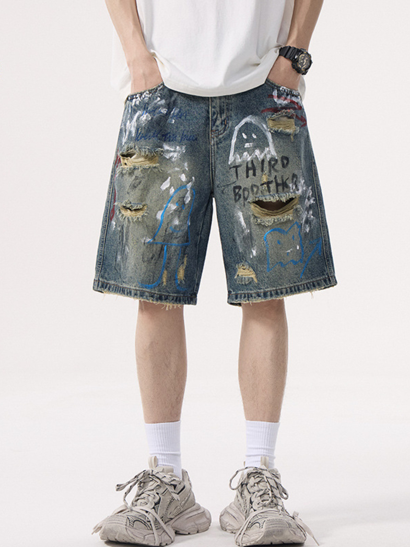 Men's Distressed Graffiti Denim Shorts