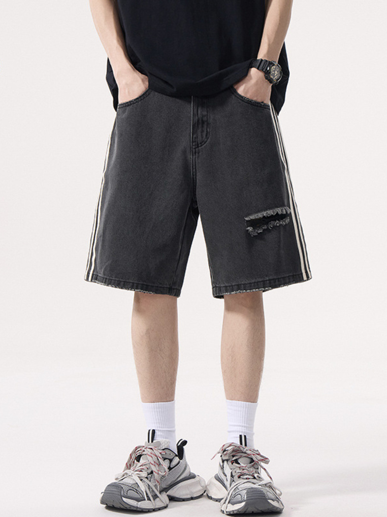 Men's Distressed Side Striped Denim Shorts