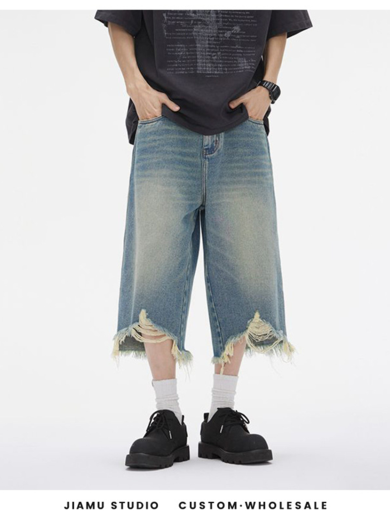 Men's Distressed Wide Leg Denim Shorts
