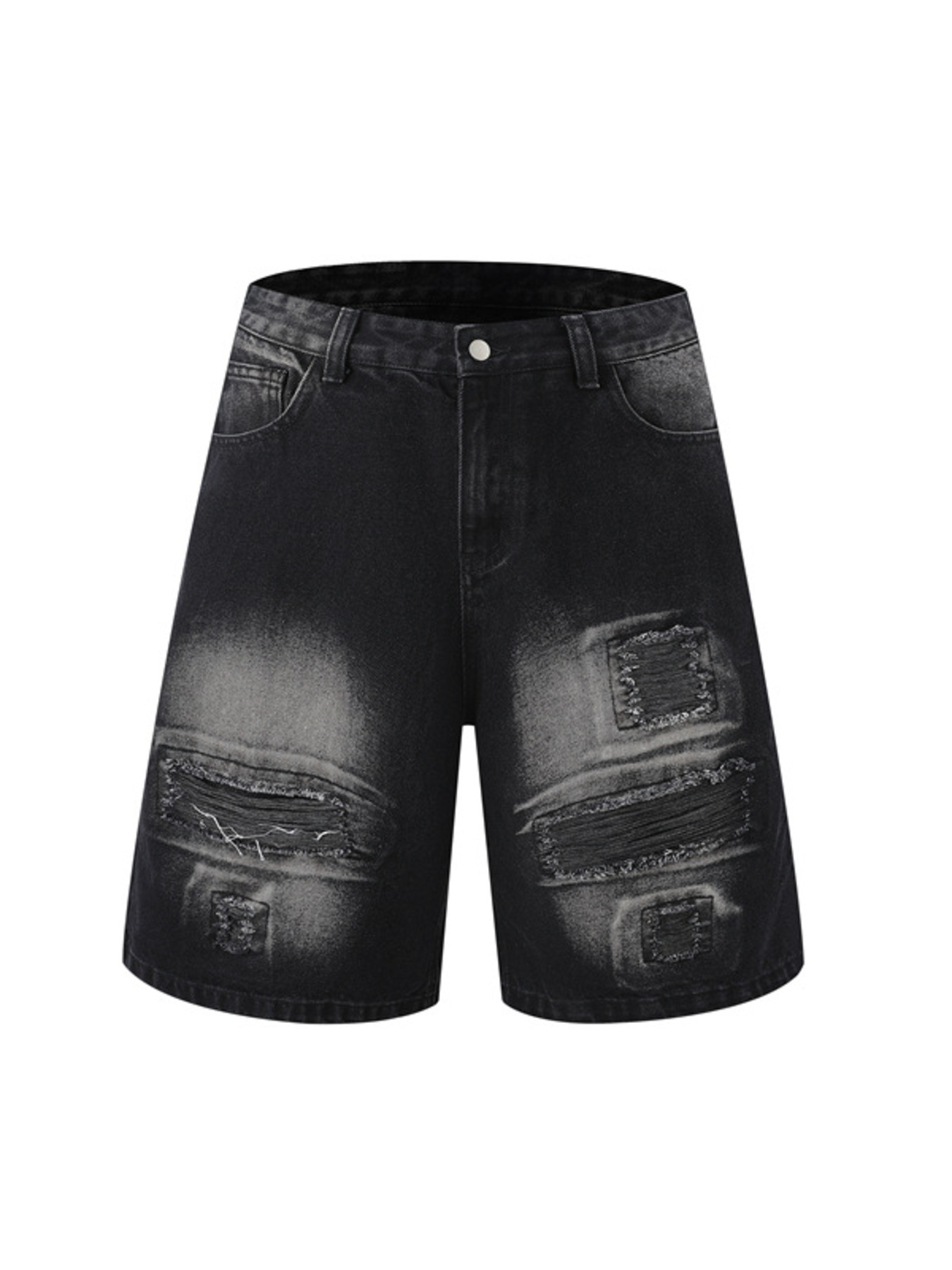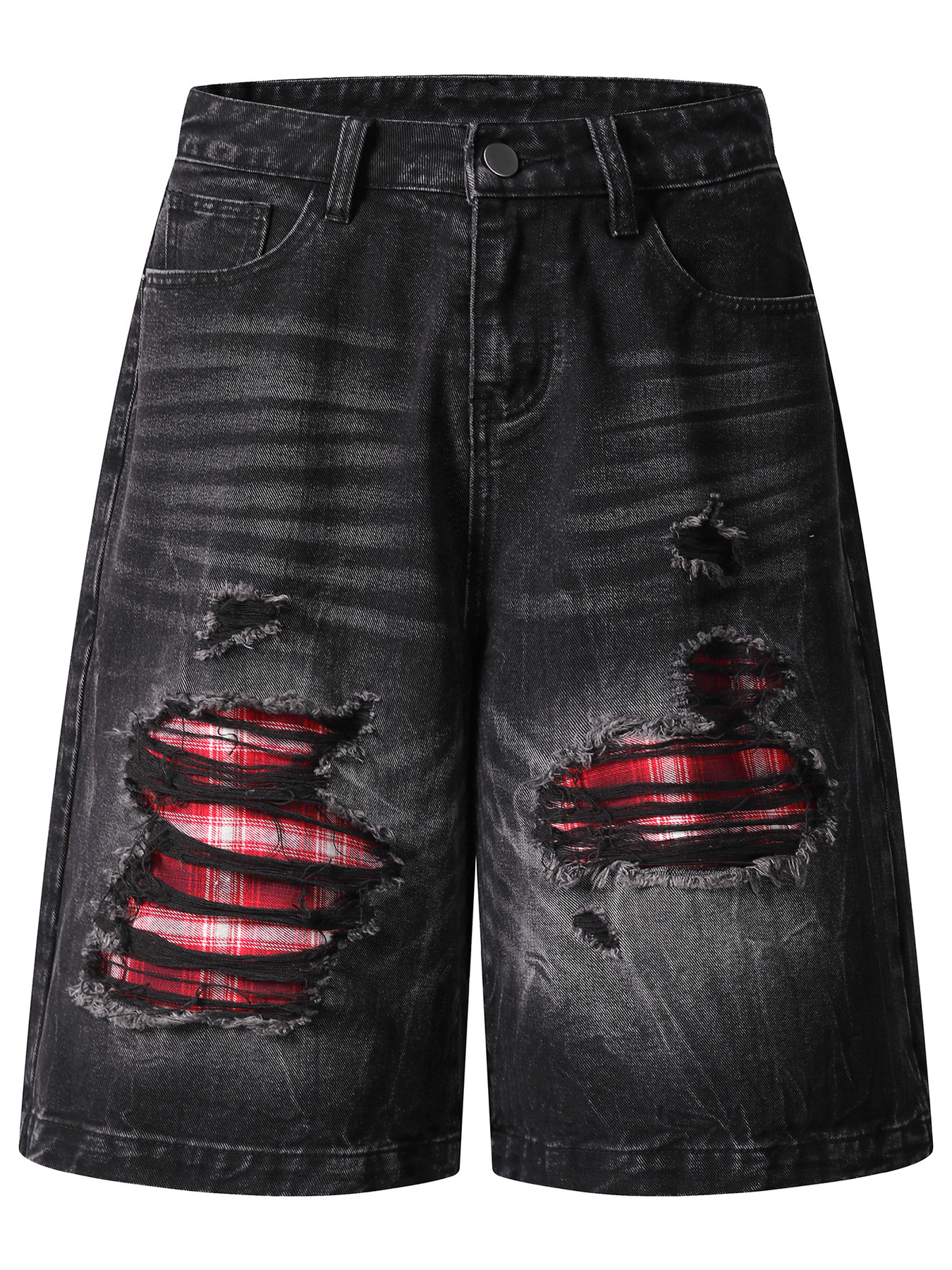 Men's Distressed Denim Shorts with Plaid Patches