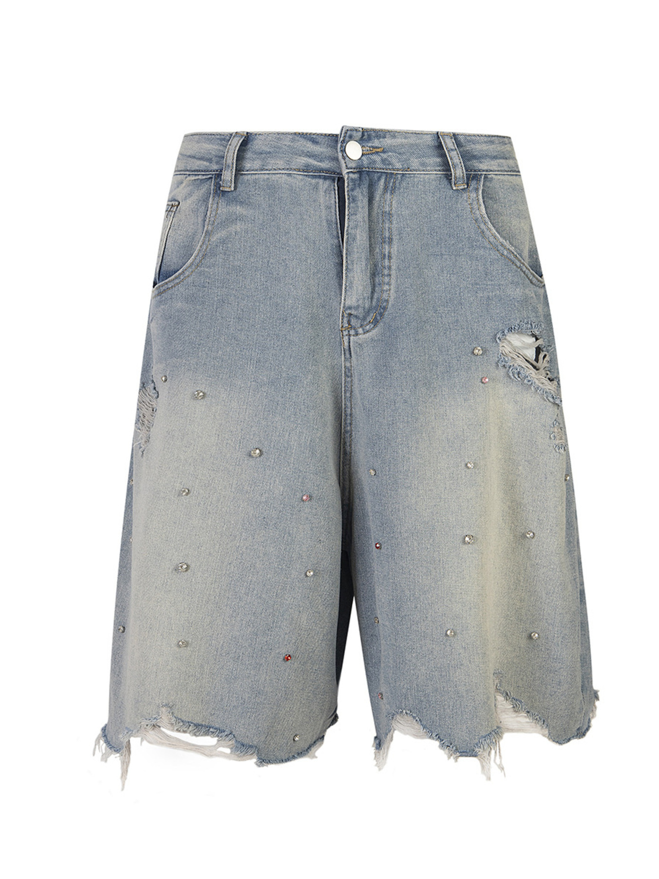 Men's Distressed Rhinestone Frayed Hem Denim Shorts