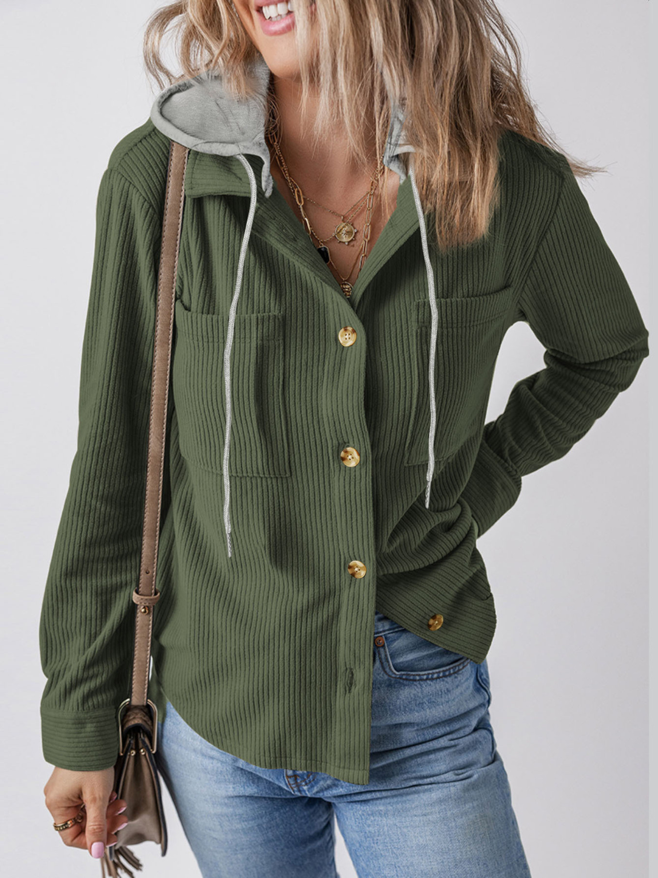 Solid Color Ribbed Zip Up Drawstring Hooded Jacket