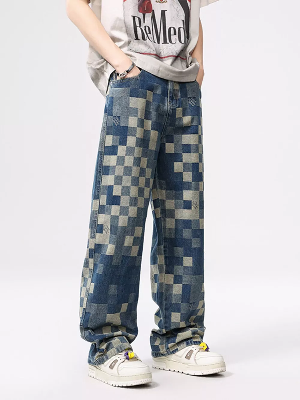 Men's Checkered Wide Leg Jeans