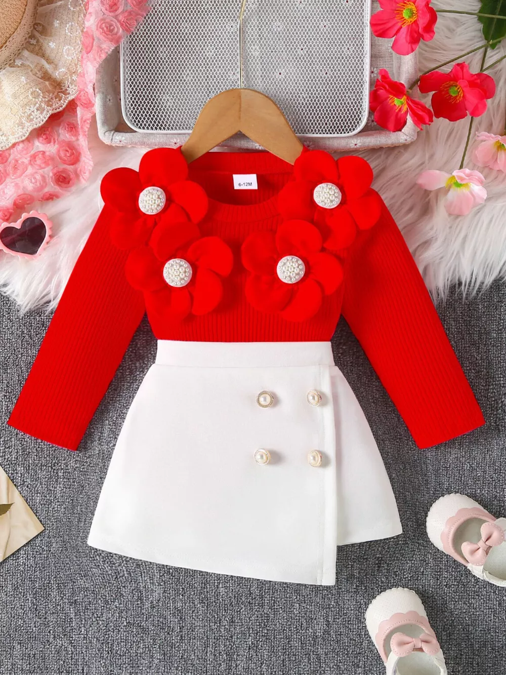 Children's Floral Applique Ribbed Top & Button Decor Skirt Set