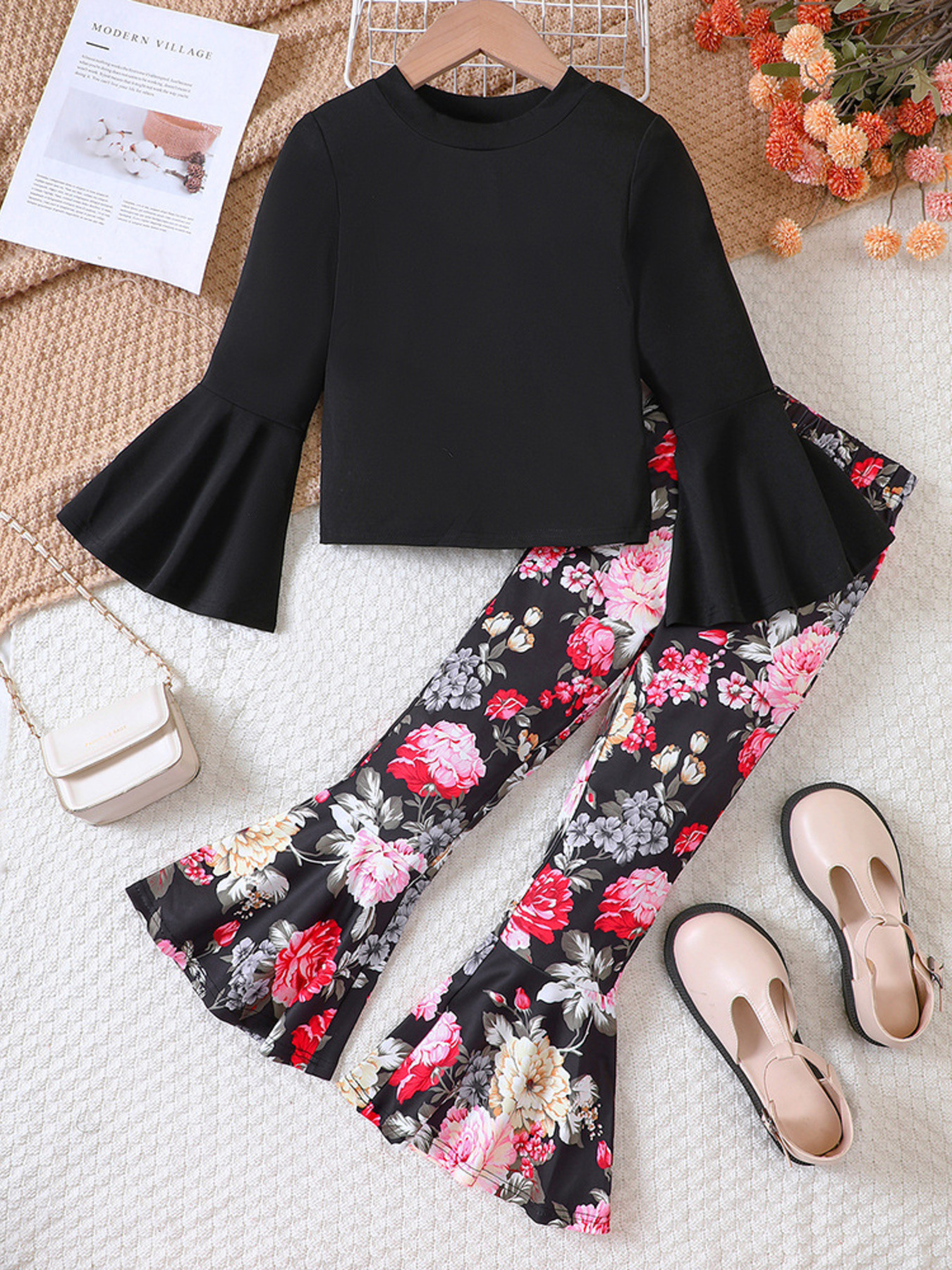 Children's Floral Applique Ribbed Top & Flare Leg Pants Set