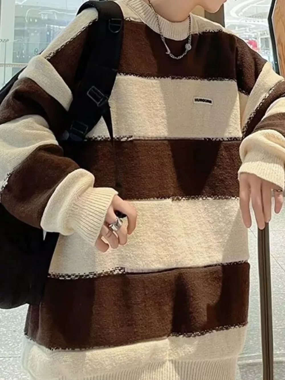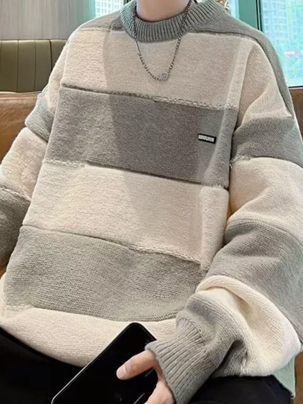 Men's Striped Fuzzy Knit Round Neck Sweater
