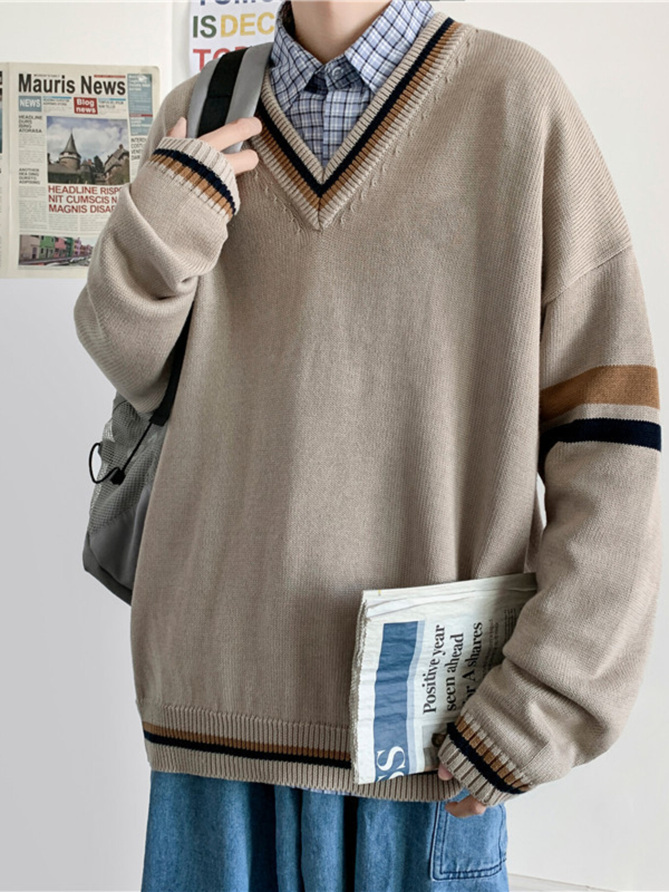 Men's Plus Size V-Neck Striped Trim Knitted Pullover