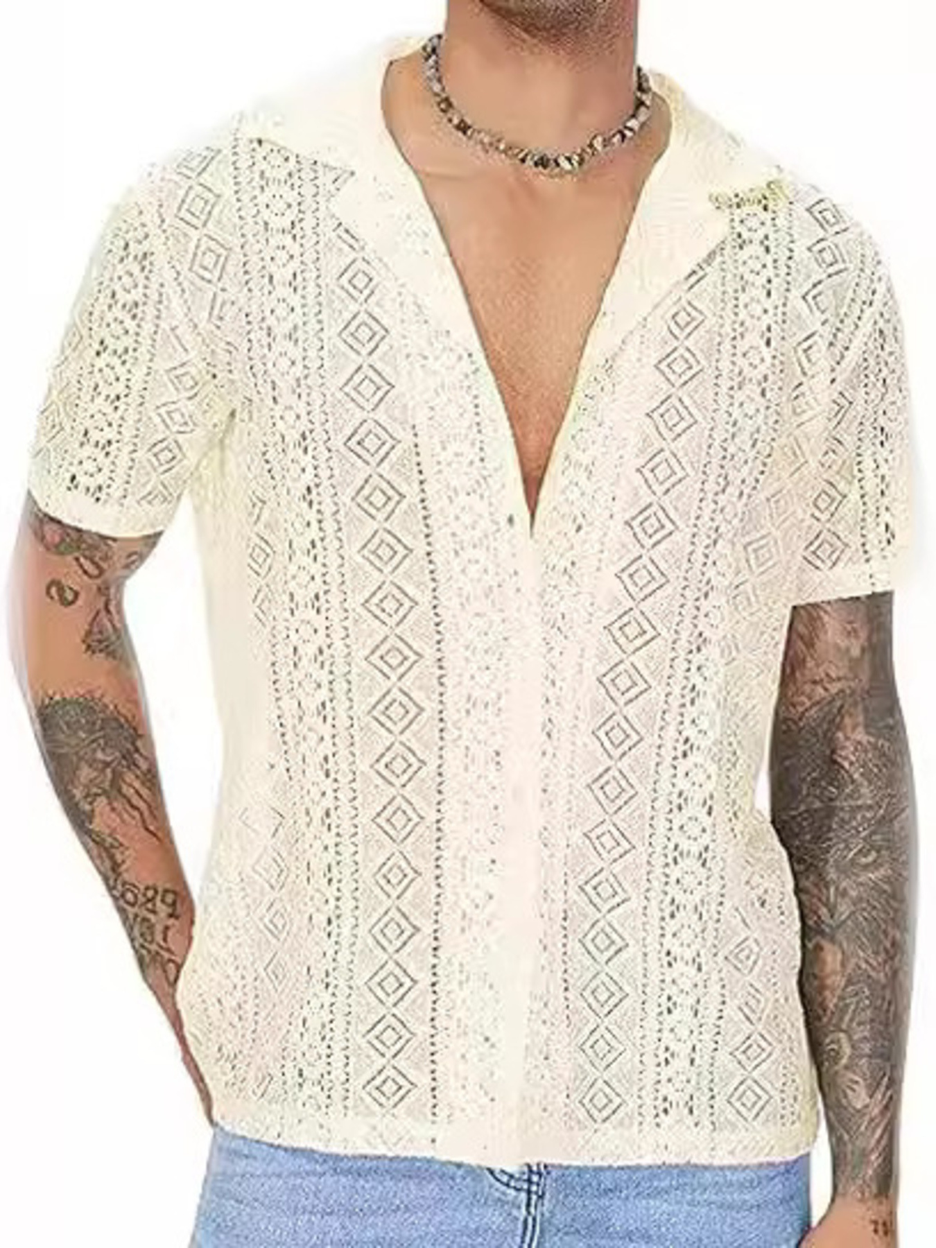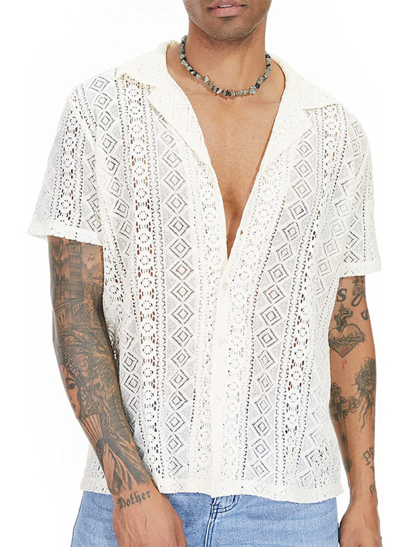 Men's Full Size Lace Button Up Short Sleeve Shirt Plus Size