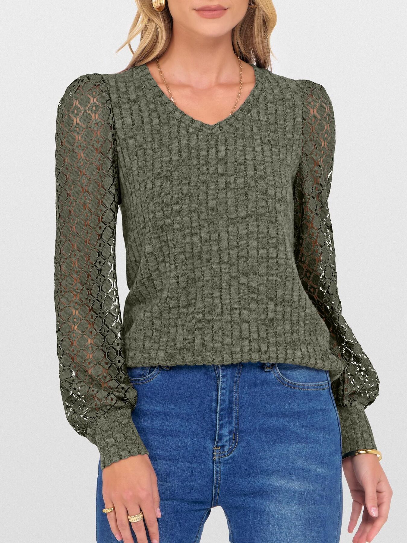Lace Trim Button Cuff Long Sleeve Sweater