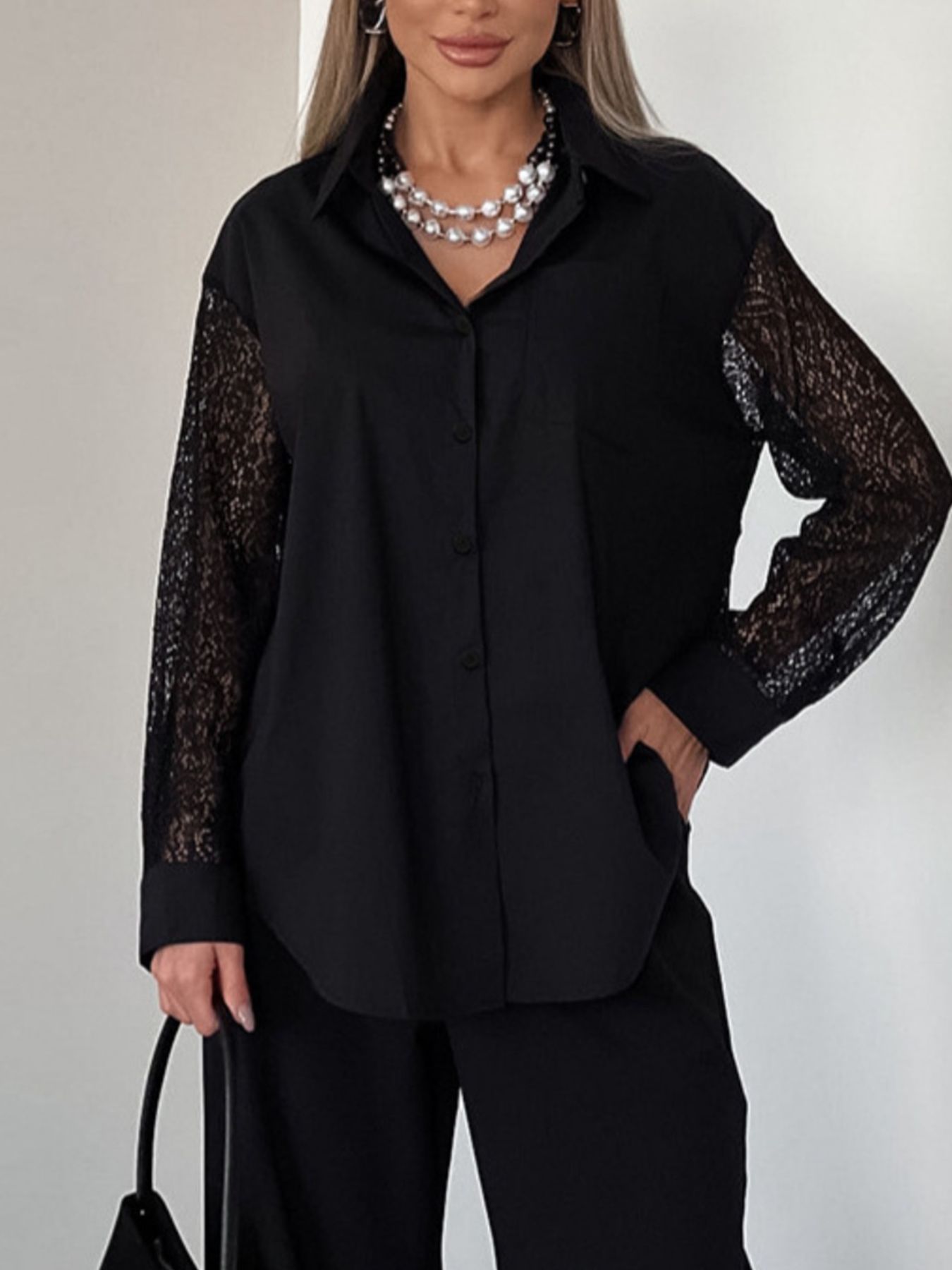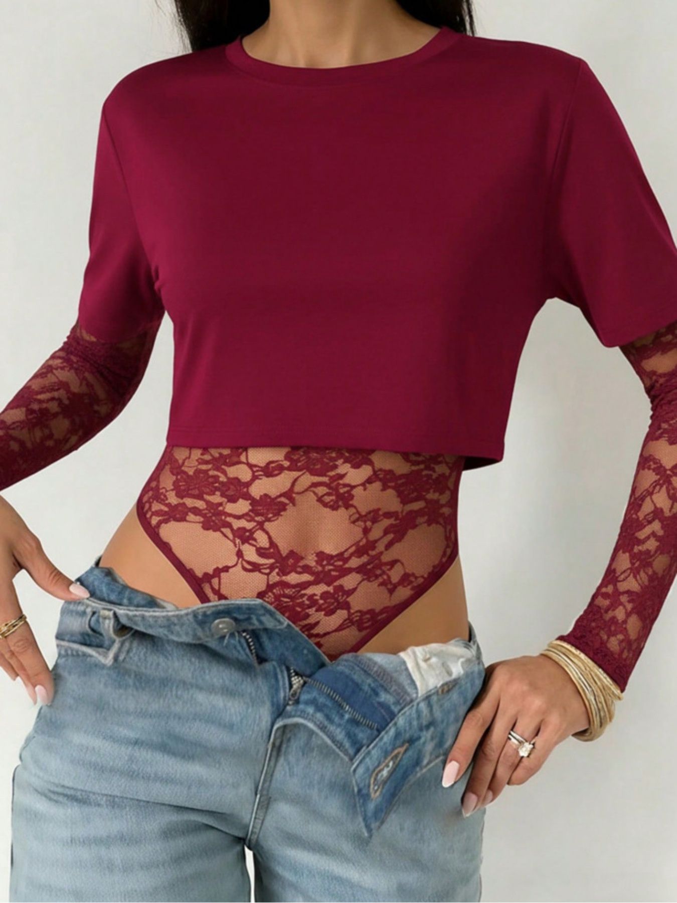 Asymmetric Panels Sheer Floral Lace Patchwork Long Sleeve Top
