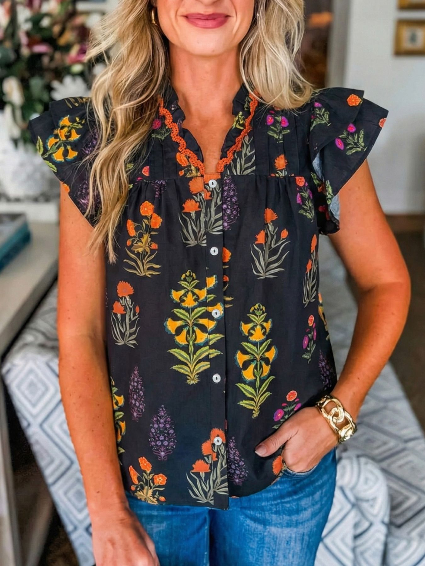 Floral Print Lace Trim Frilled V Neck Short Sleeve Shirt