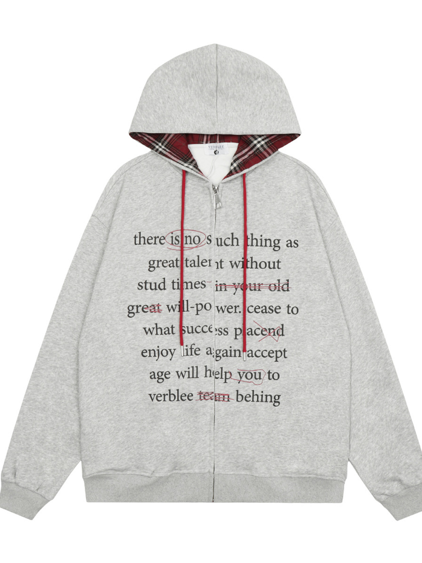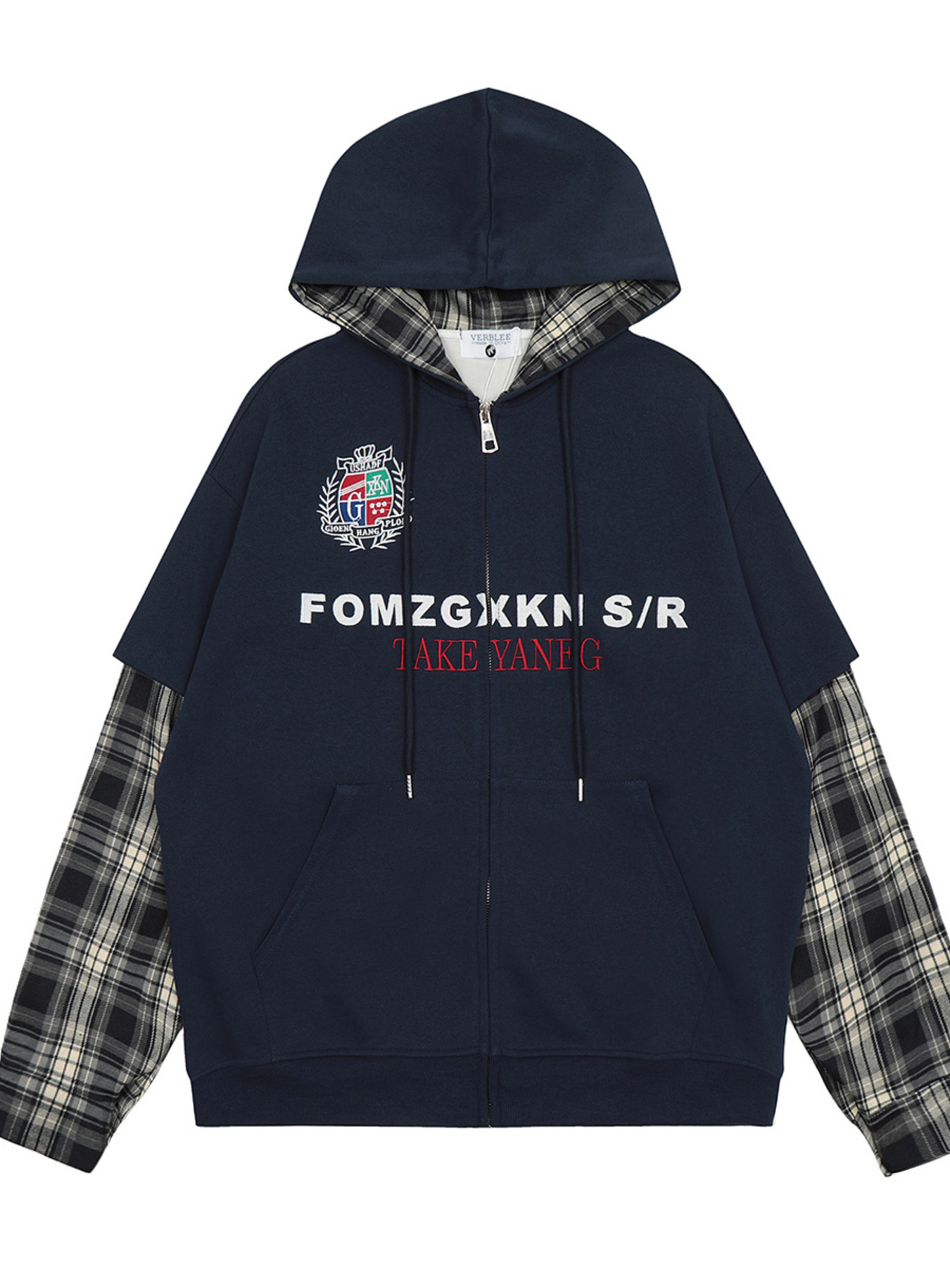 Men's Plaid Sleeve Patchwork Letter Zip-Up Hoodie
