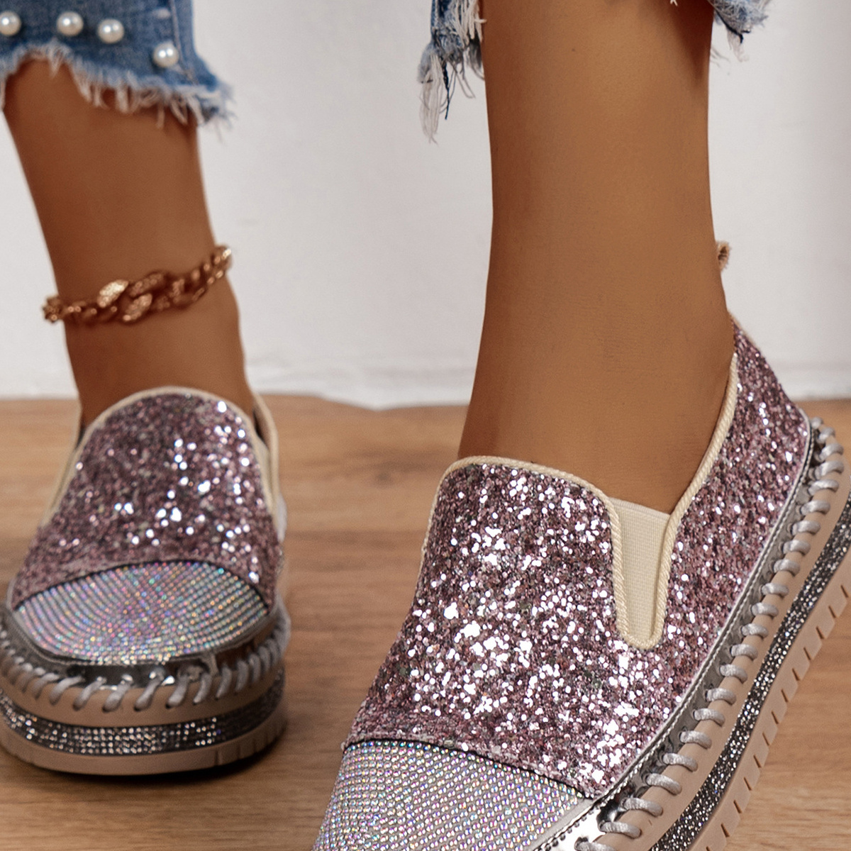 Rhinestone Sequin Round Toe Platform Loafers