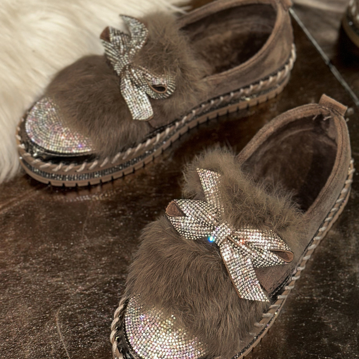 Fuzzy Bowknot Rhinestone Platform Loafers