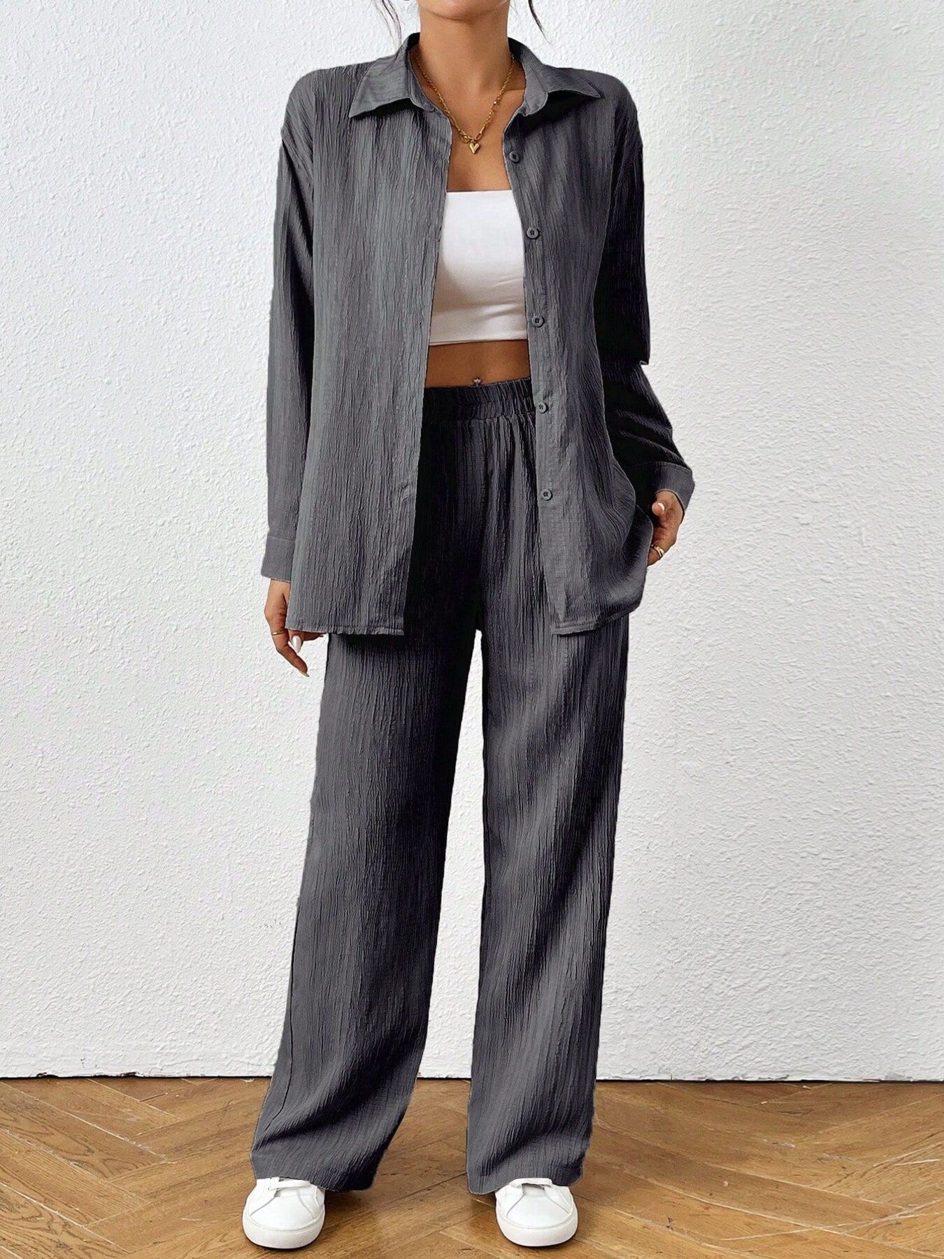 Button Collar Drop Shoulder Top and Shorts 2pcs Set