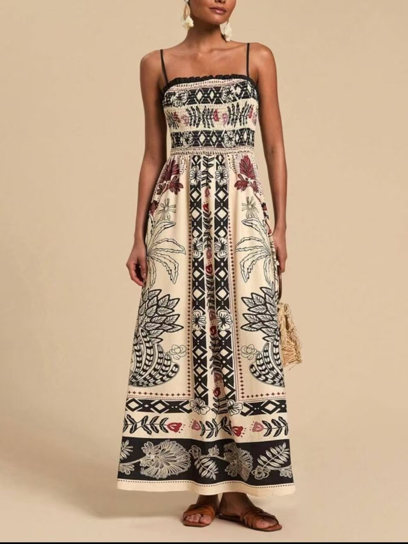 Smocked Printed Tie Shoulder Maxi Dress