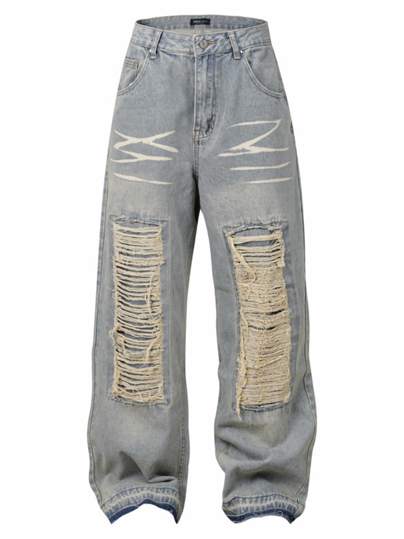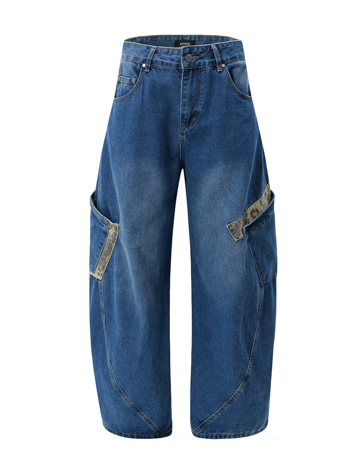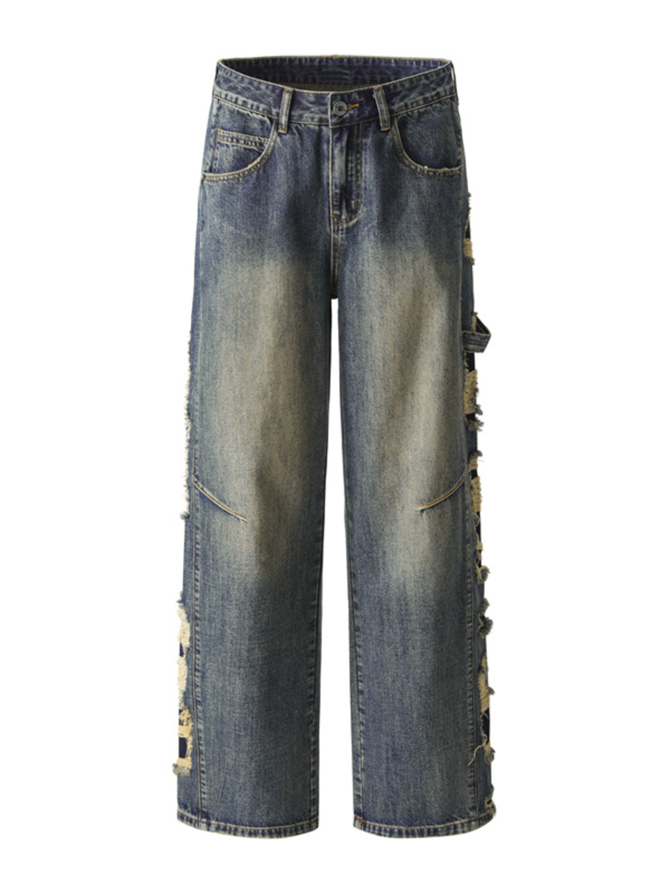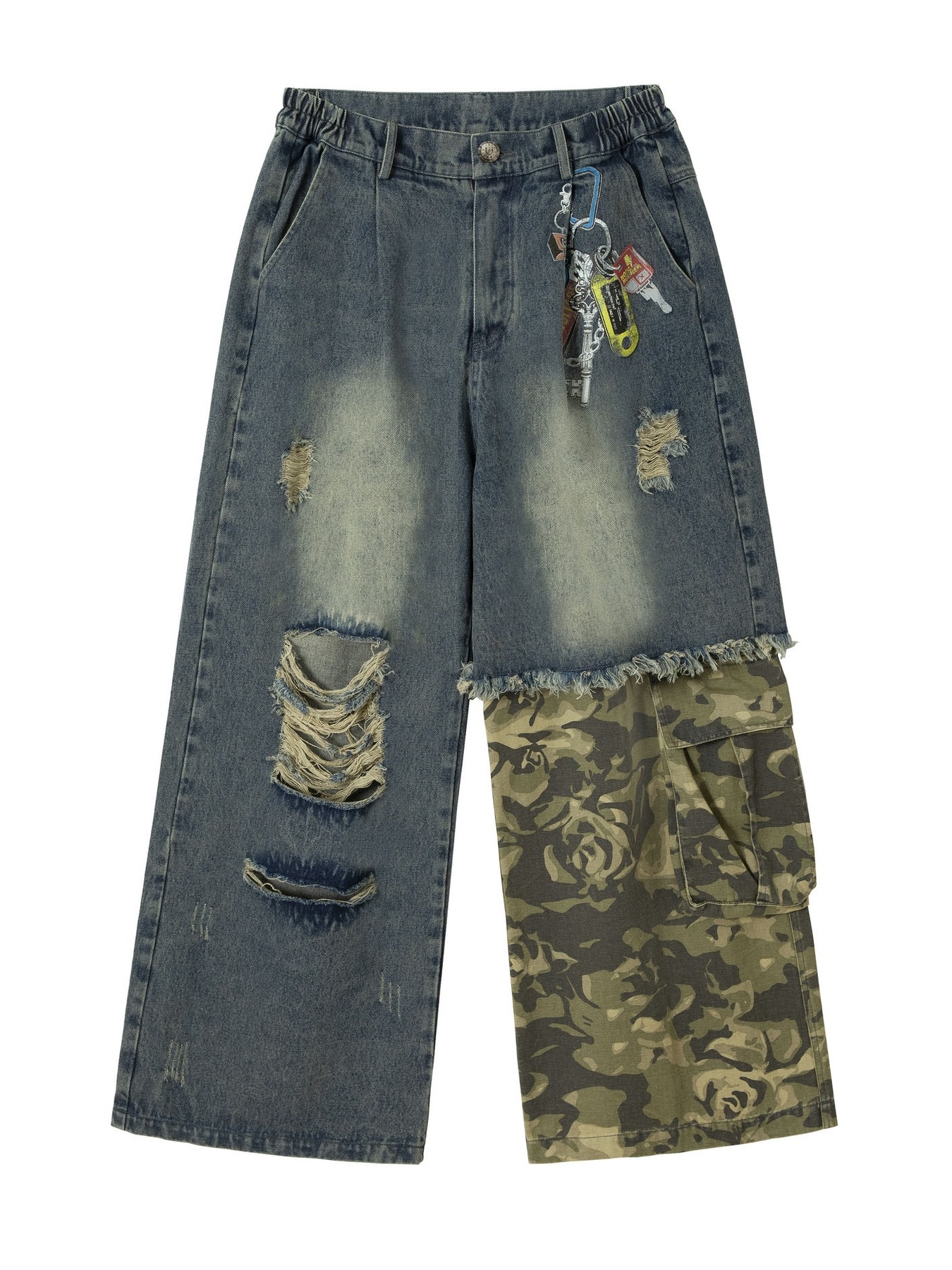 Men's Distressed Camouflage Patchwork Wide Leg Jeans