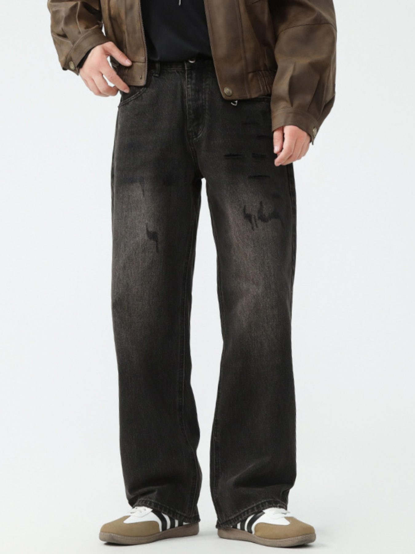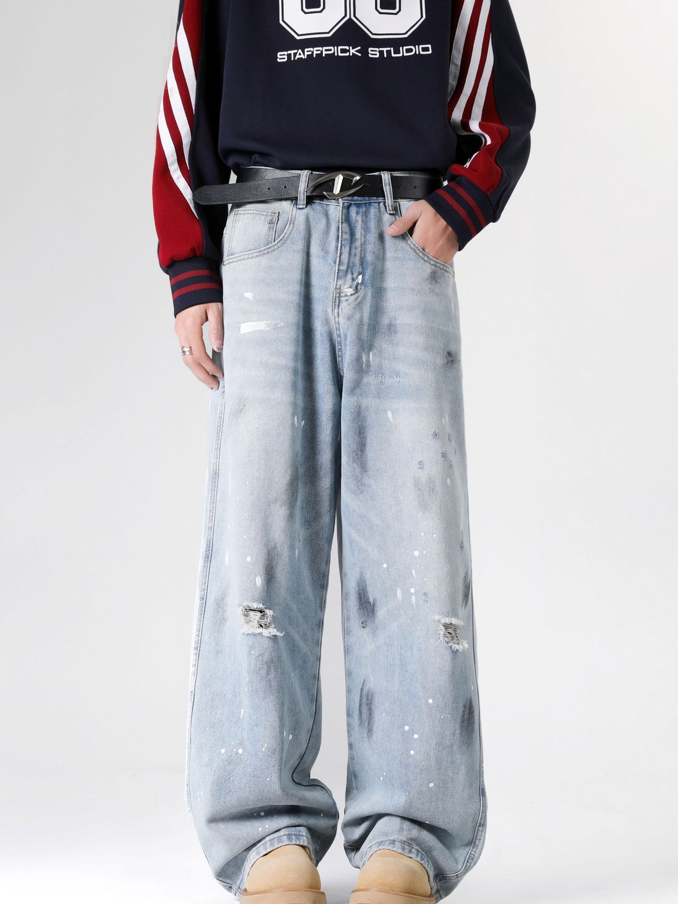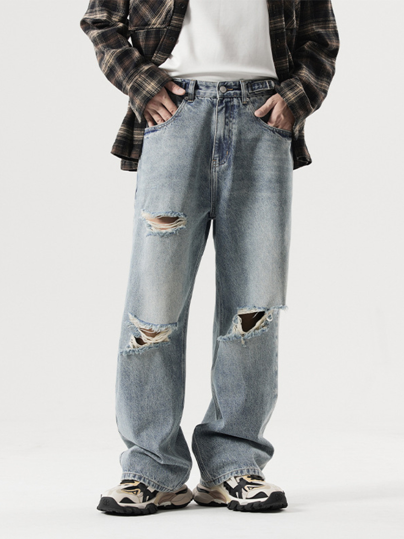 Men's Full Size Vintage Wash Ripped Wide Leg Jeans Plus Size