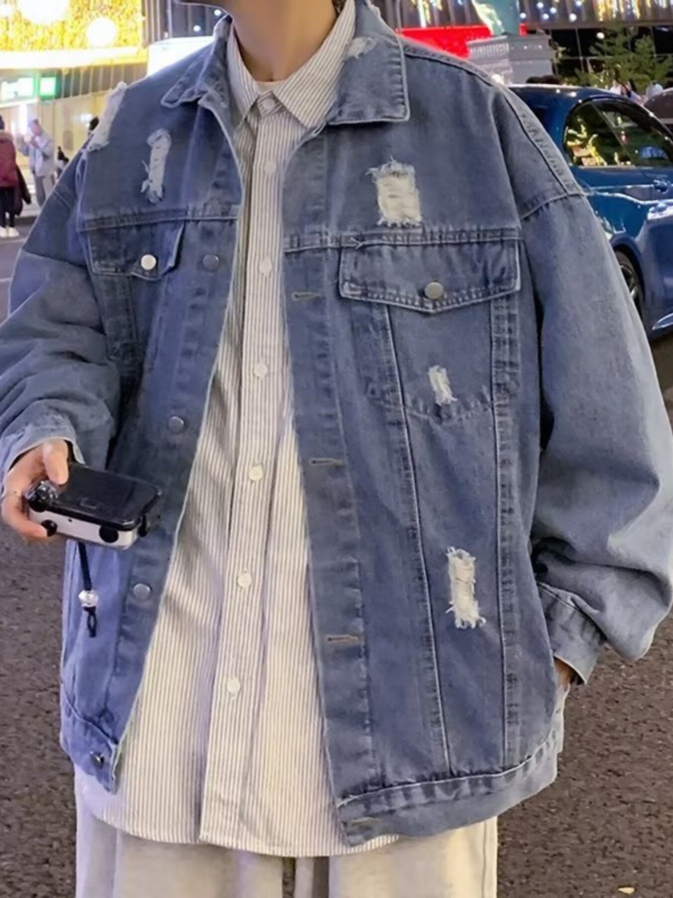 Men's Full Size Distressed Button Up Denim Jacket Plus Size