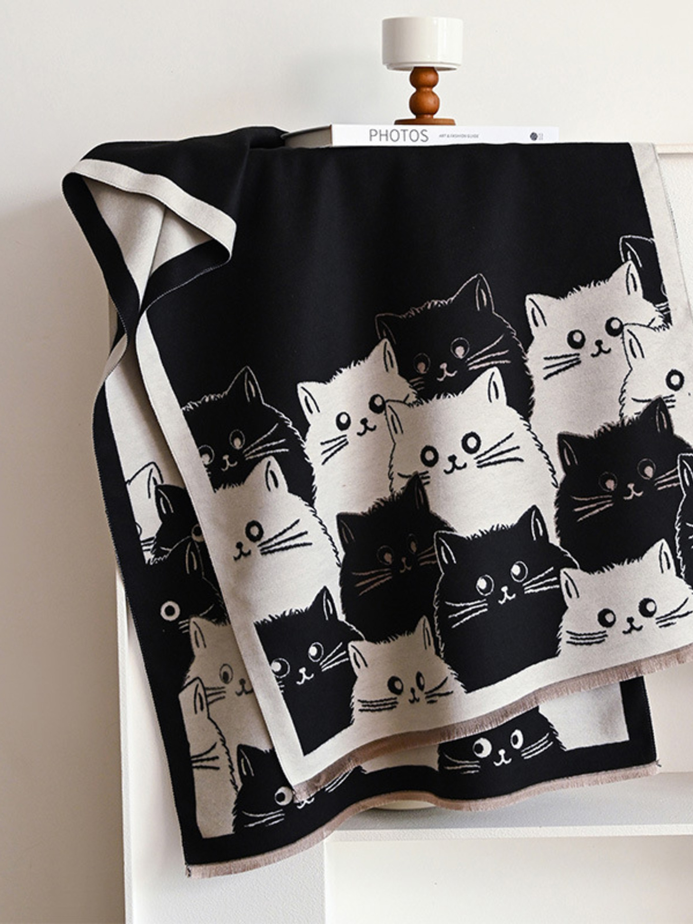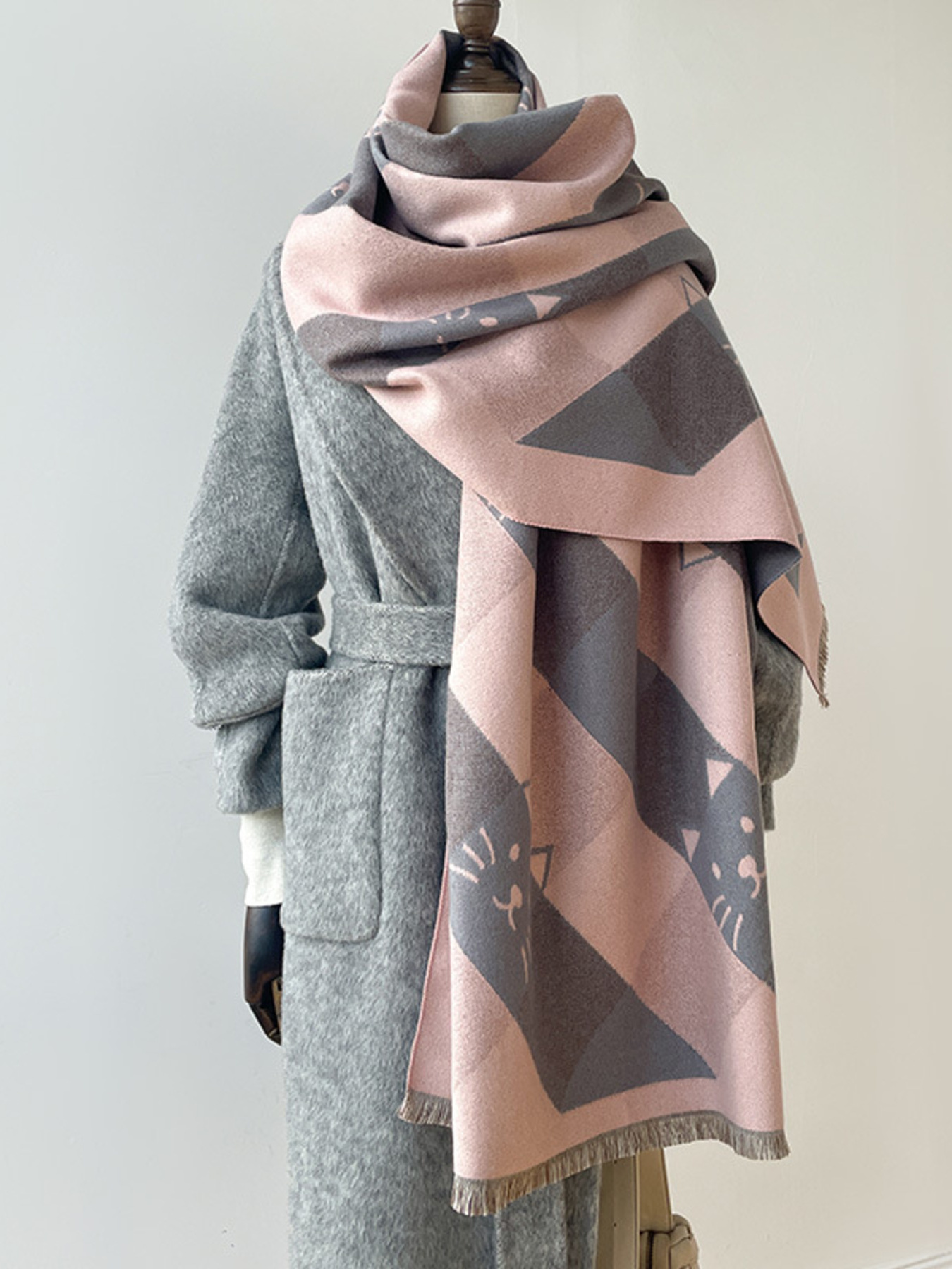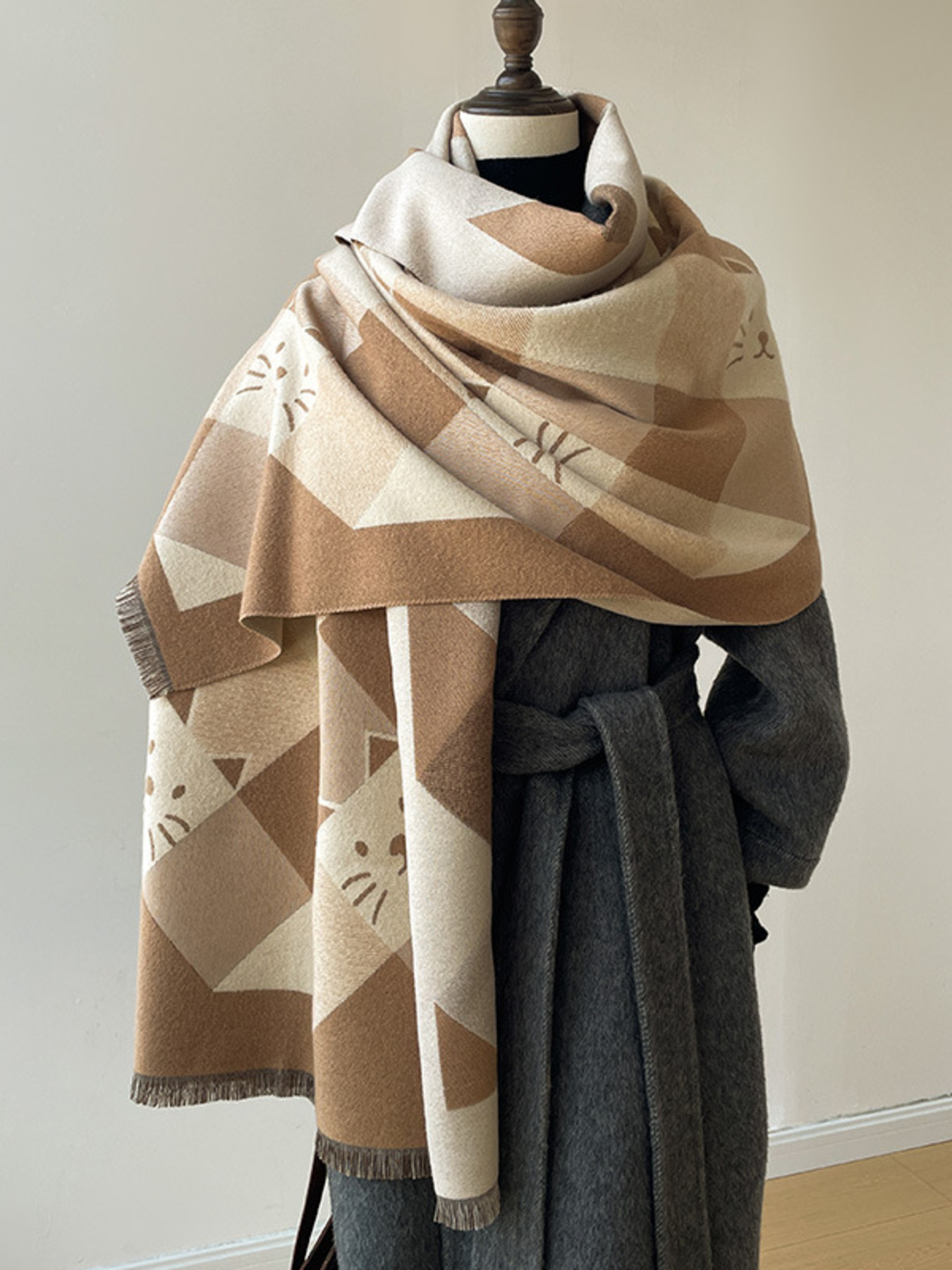 Cute Cat Pattern Plaid Raw Hem Scarf