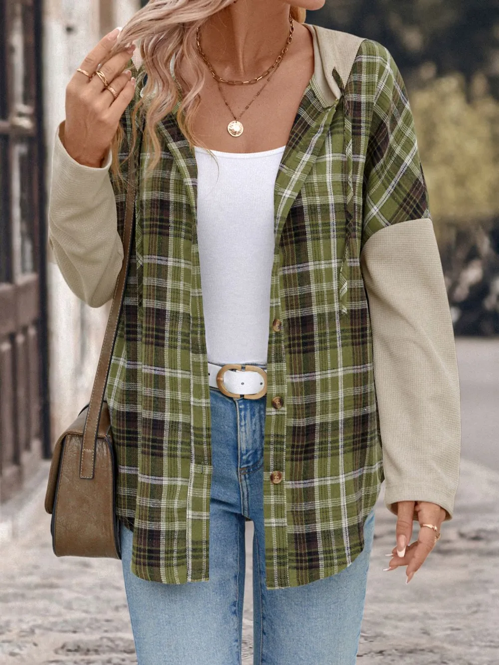 Drawstring Plaid Long Sleeve Hooded Shirt