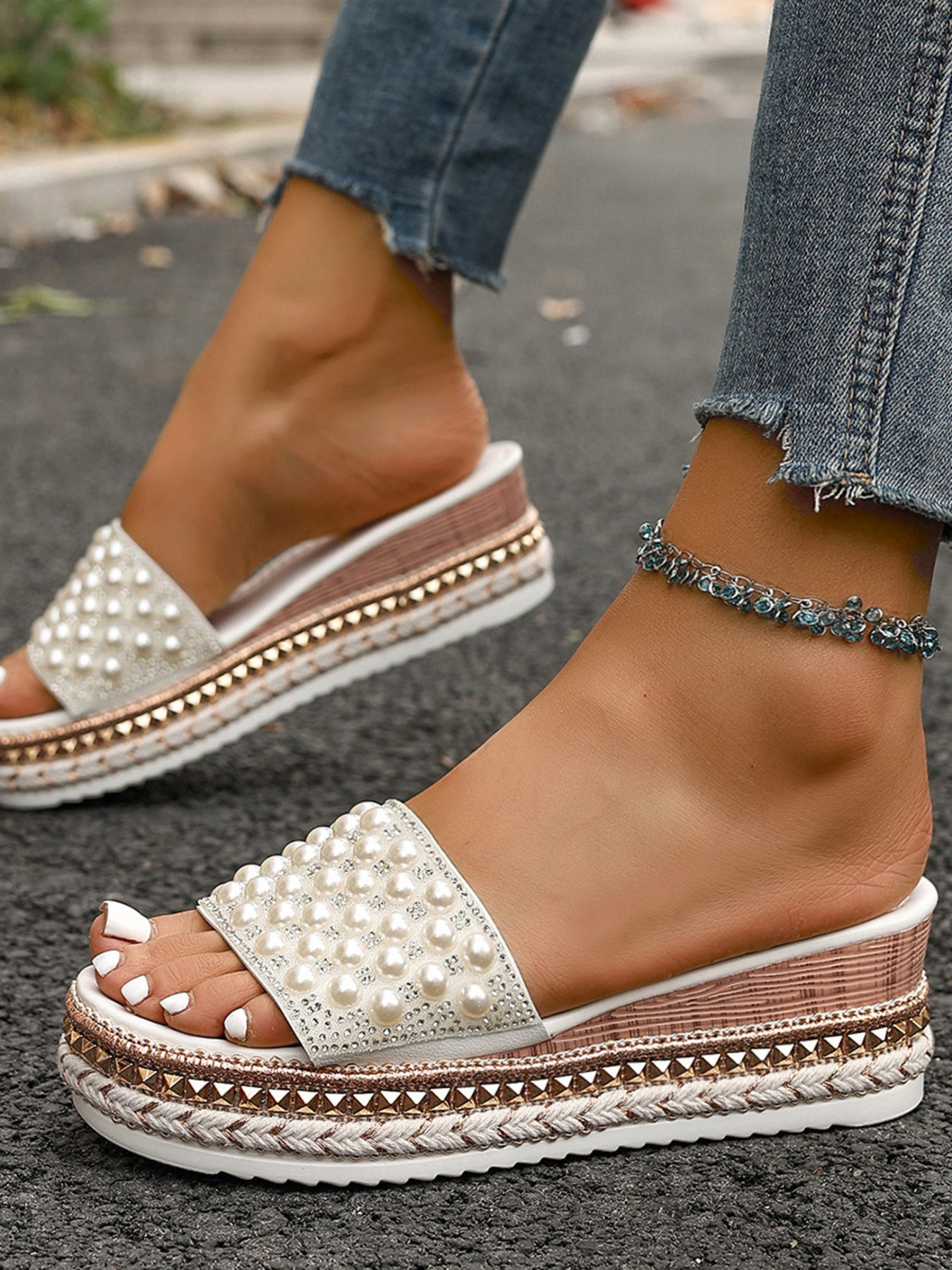 Pearl Embellished Platform Slide Sandals
