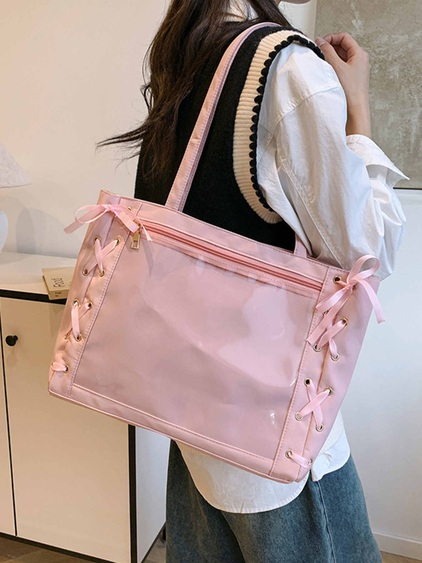 Lace-Up Trim Clear Panel Shoulder Bag
