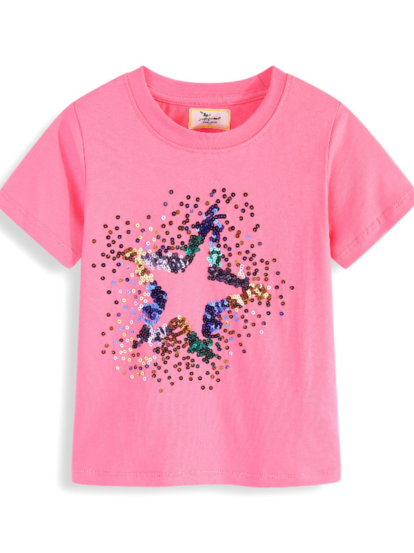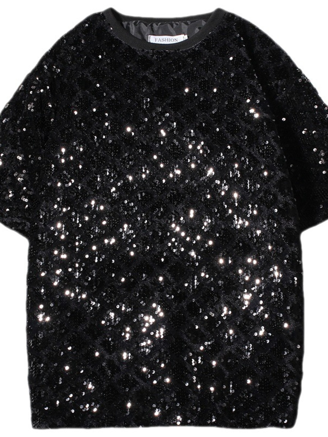 Sequin Love Heart Patched Crew Neck Casual Tee