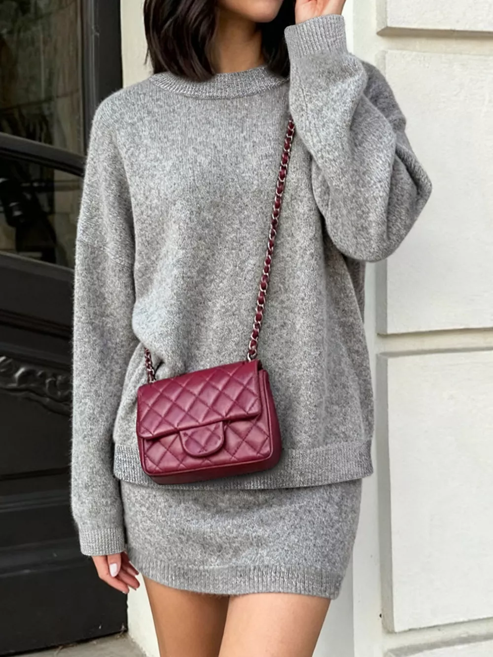 Two-Tone Ribbed Knit Top and Skirt Sweater Set