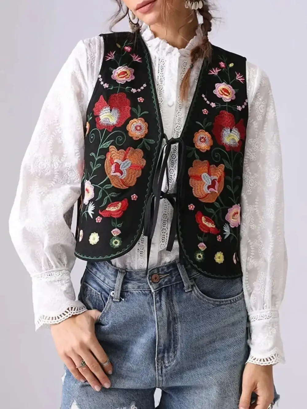 Floral Embroidered Lace-Up Vest
