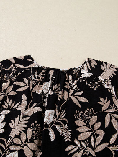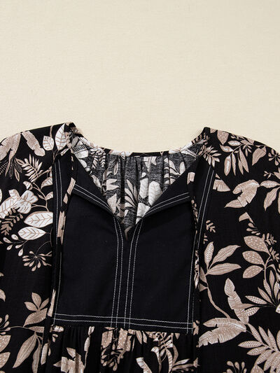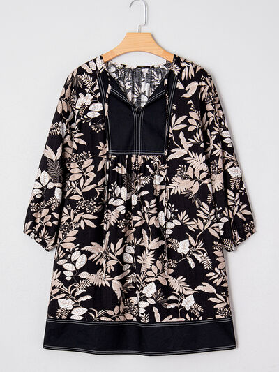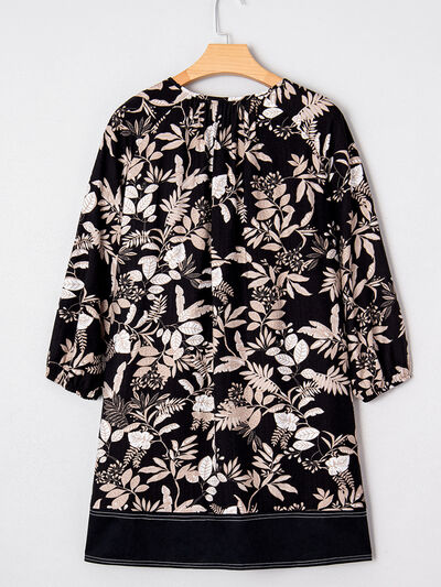 3/4 Sleeve Botanical Print Split Neck Loose Mini Dress