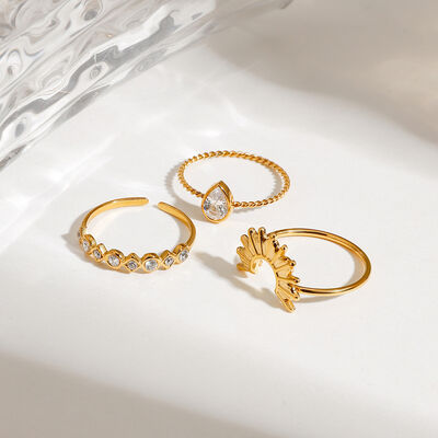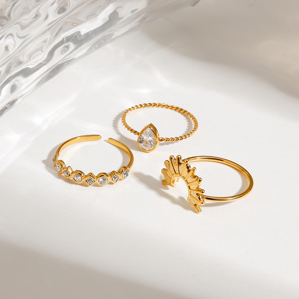 3 Piece Stainless Steel Rhinestone Sunburst Crown Ring