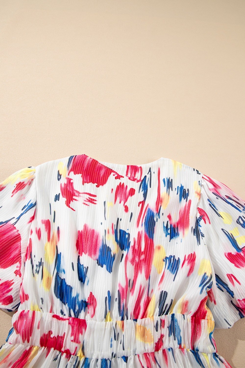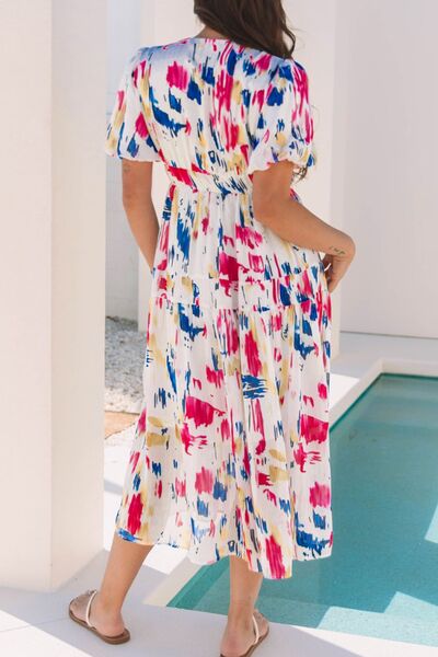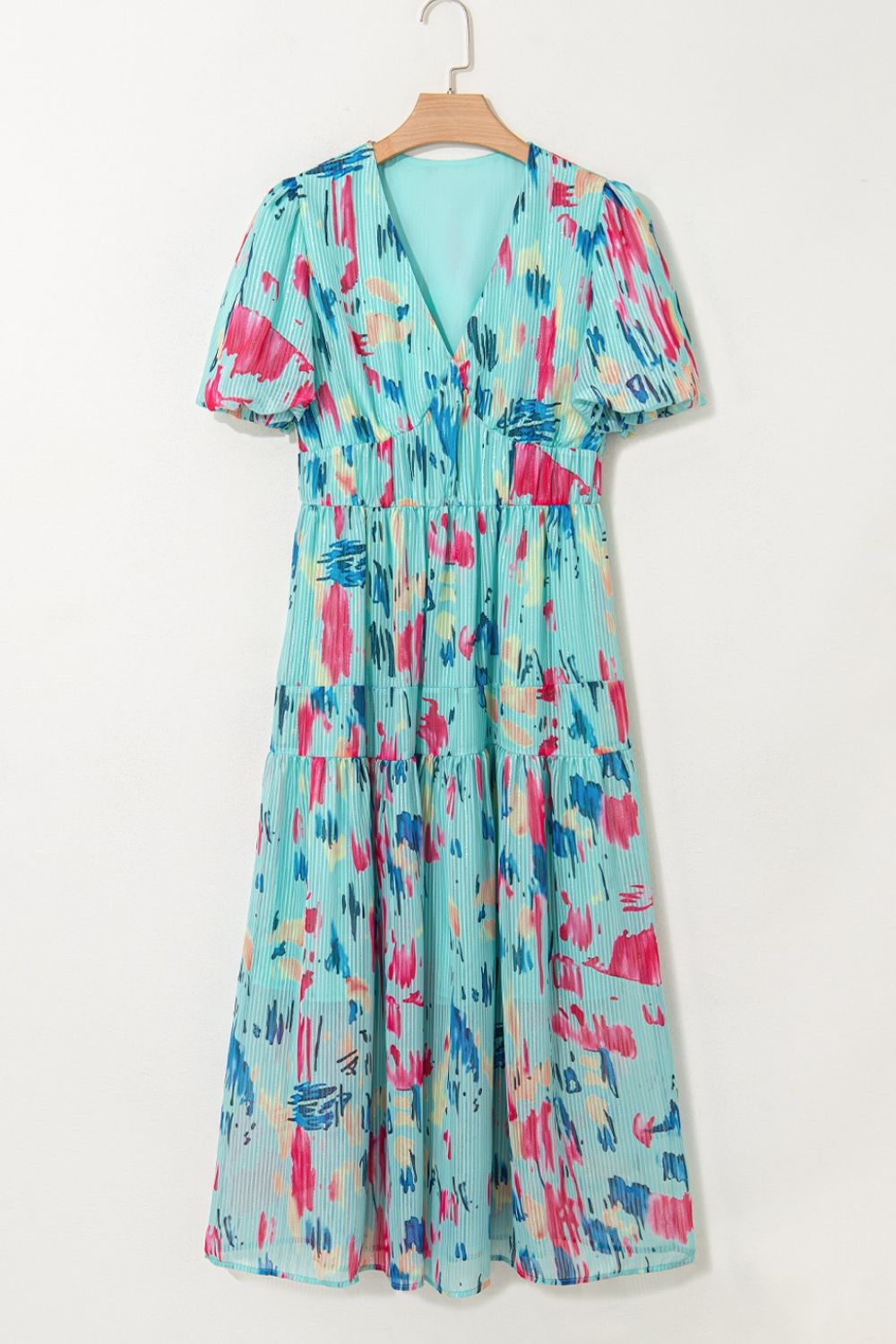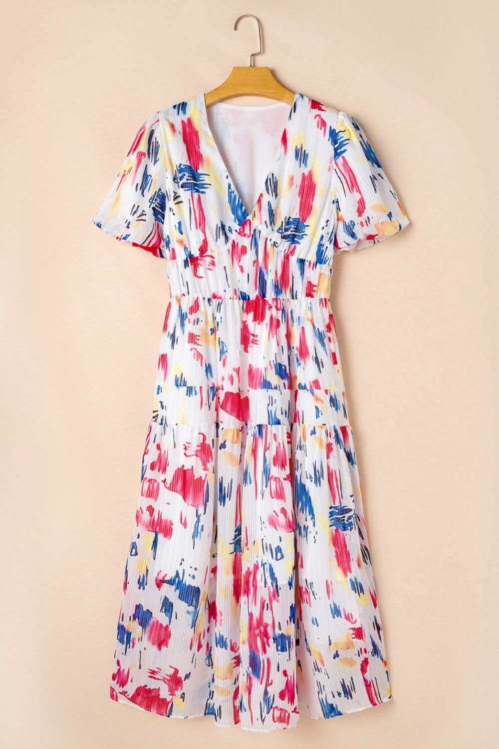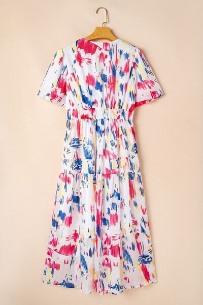 Abstract Print Short Puff Sleeve Tiered Maxi Dress