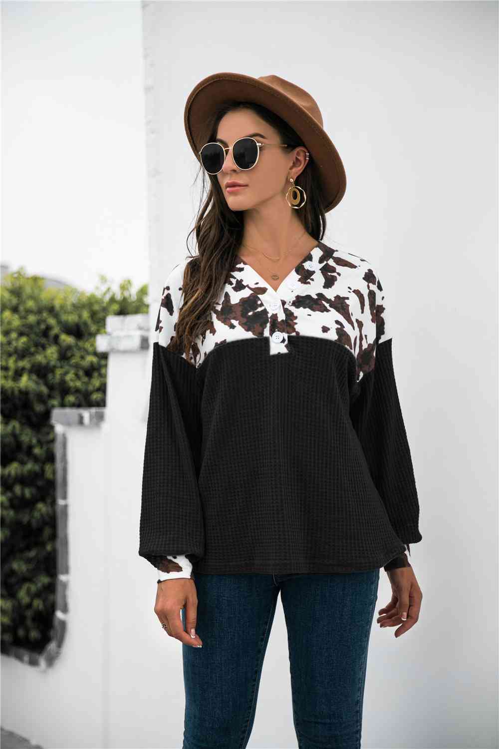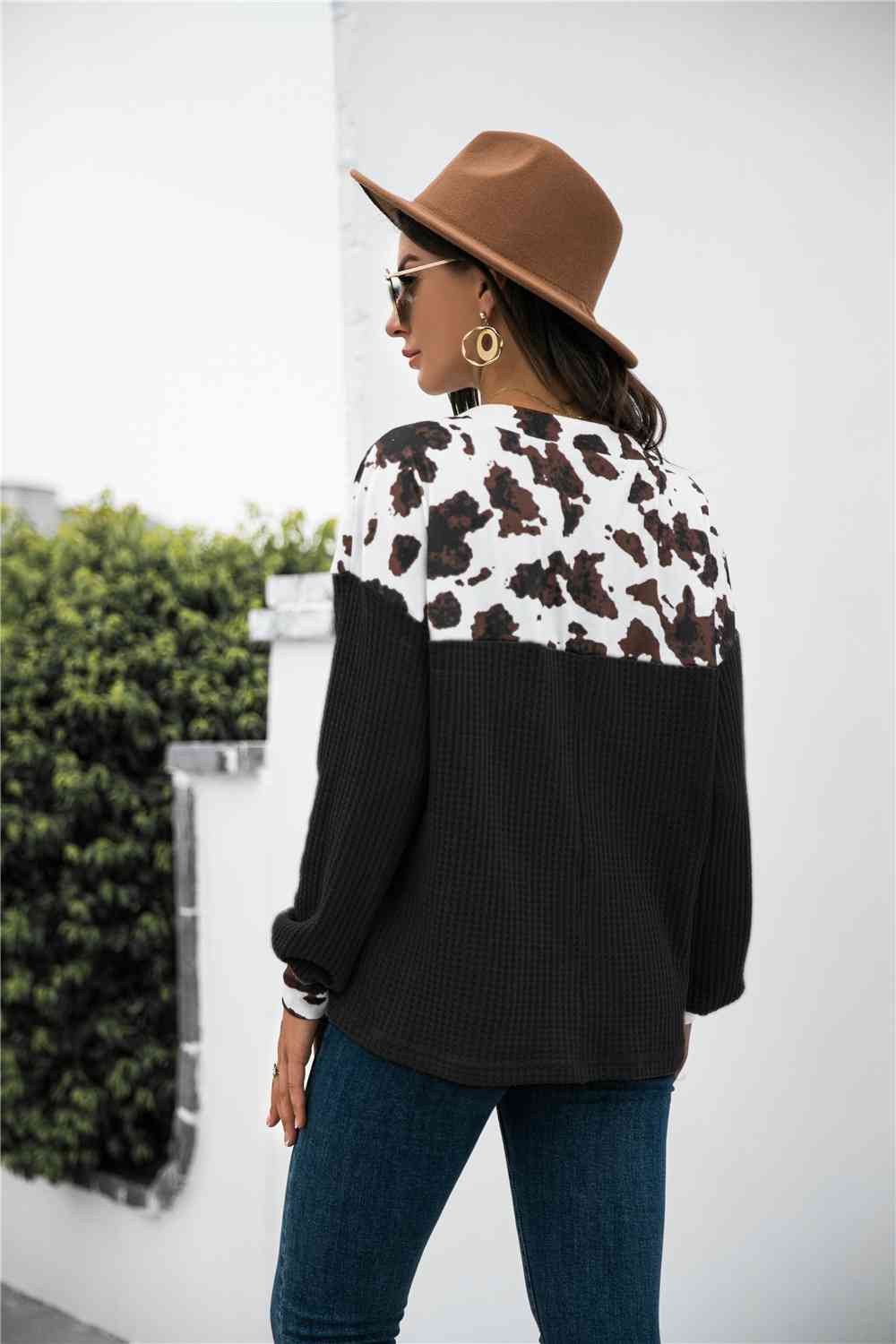 Animal Print Color Block Waffle-Knit Top