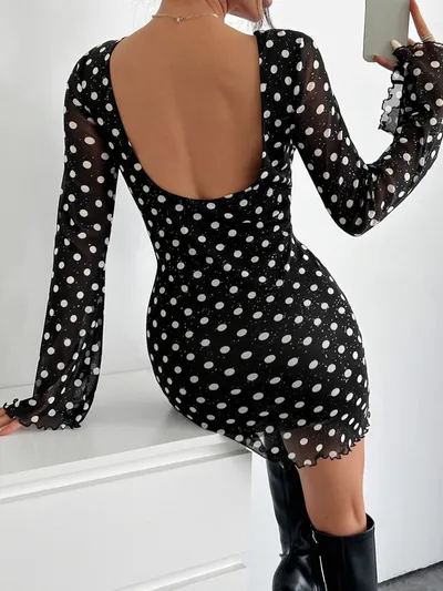 Backless Polka dot Long Sleeve Mini Mesh Dress