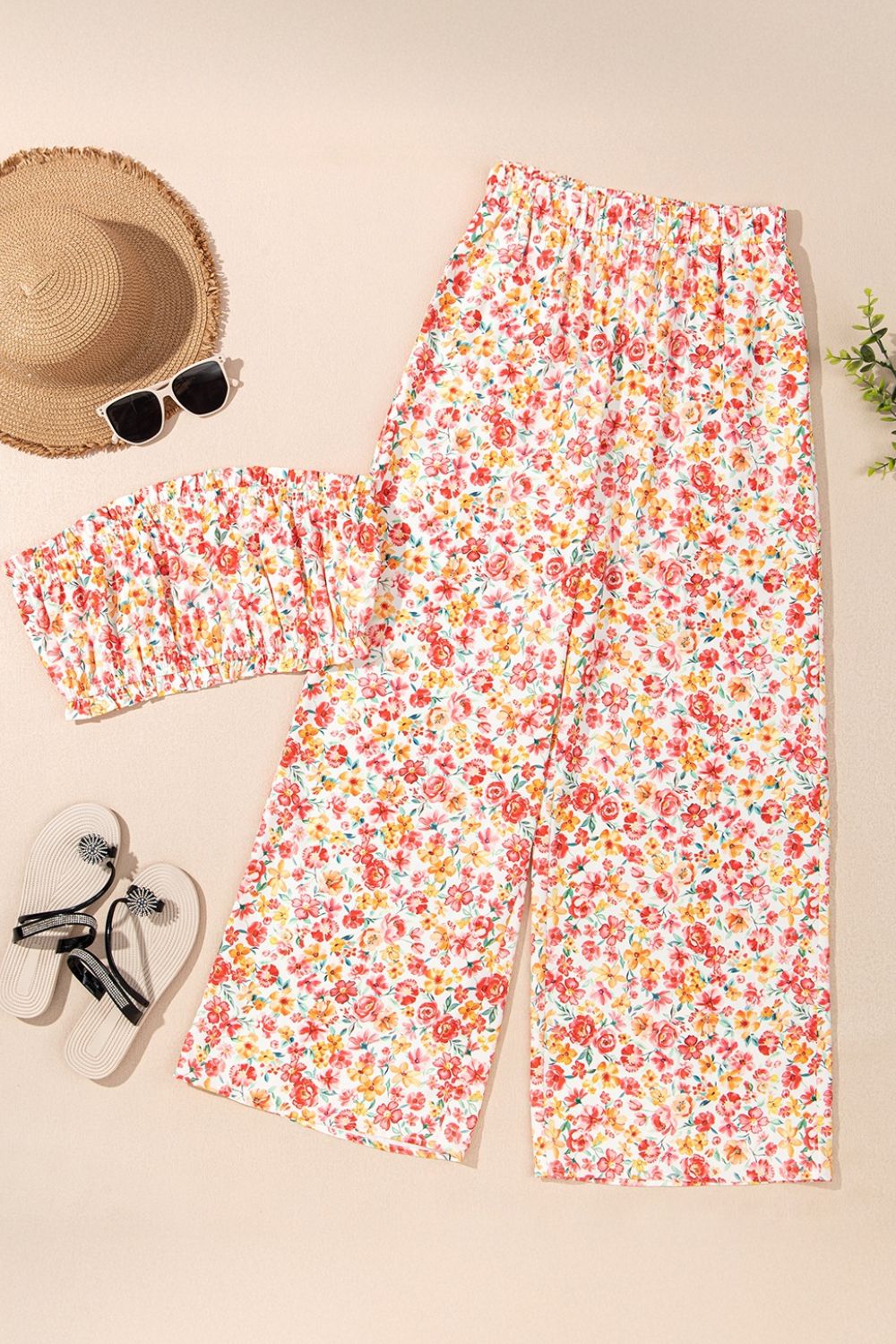 Boho Floral Bandeau Top and High Waist Wide Leg Pants Set